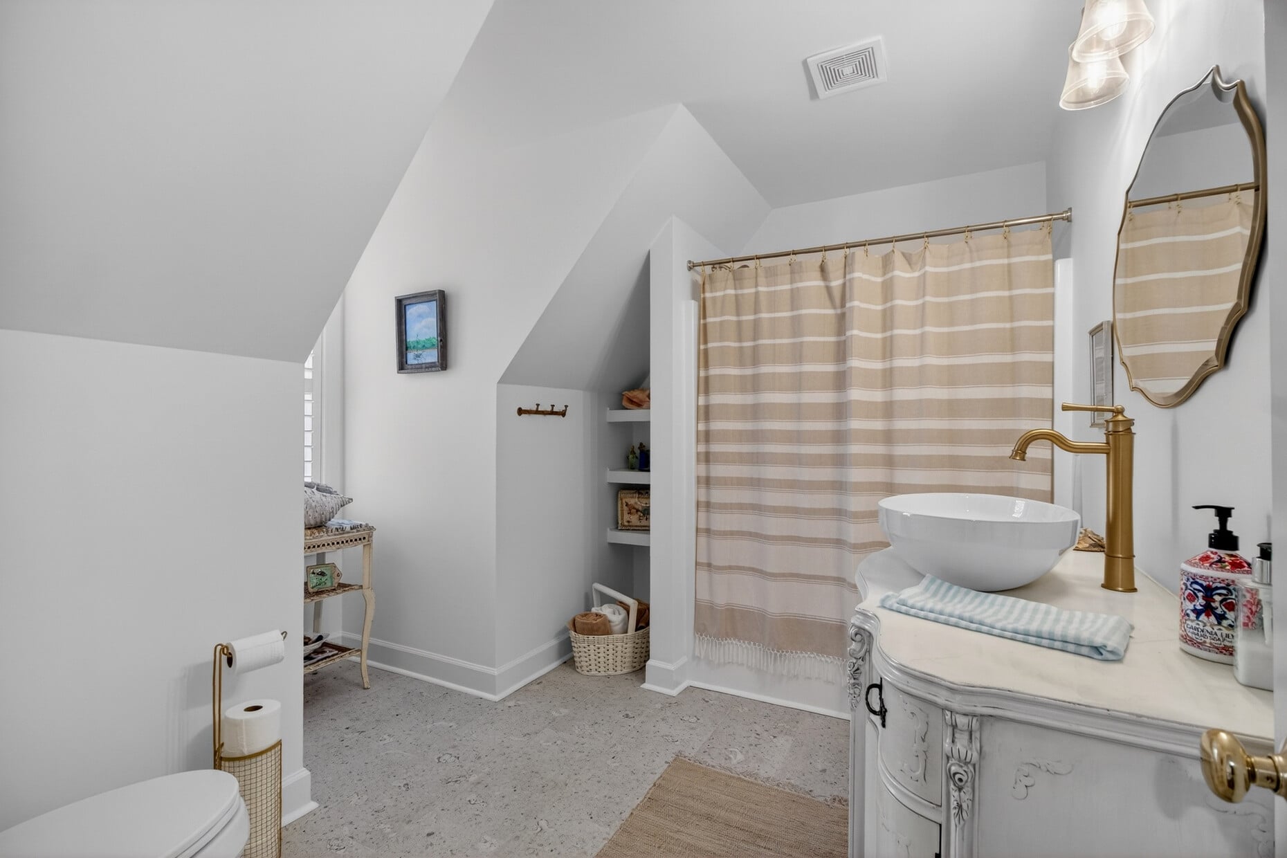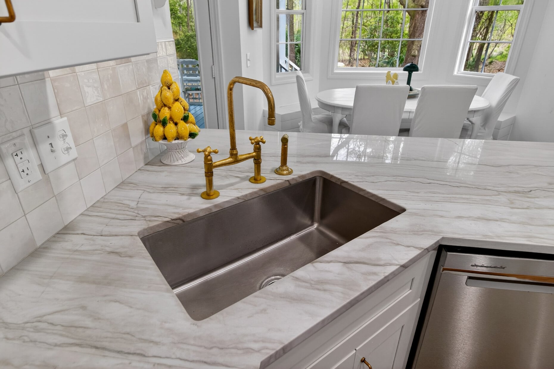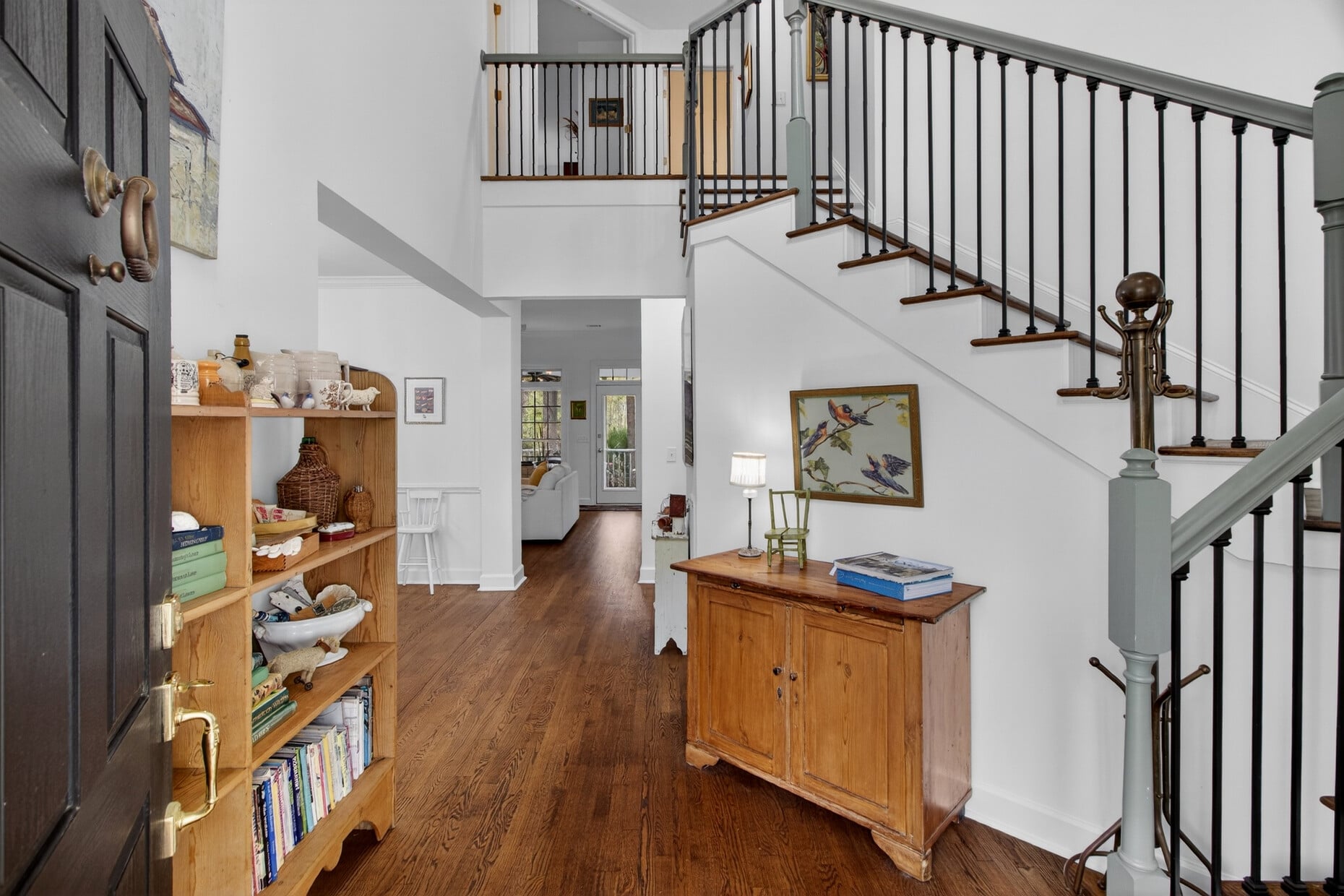 The heart of the home is a completely reimagined kitchen featuring quartzite countertops, all-new cabinetry, a fresh backsplash, updated lighting, and elegant brass faucet, knobs, and pulls — accented with charming shiplap details. A built-in bench with storage anchors the eat-in area, where a peaceful wooded view sets the tone for every morning. Refinished hardwood floors on the main level tie the space together with warmth and continuity.