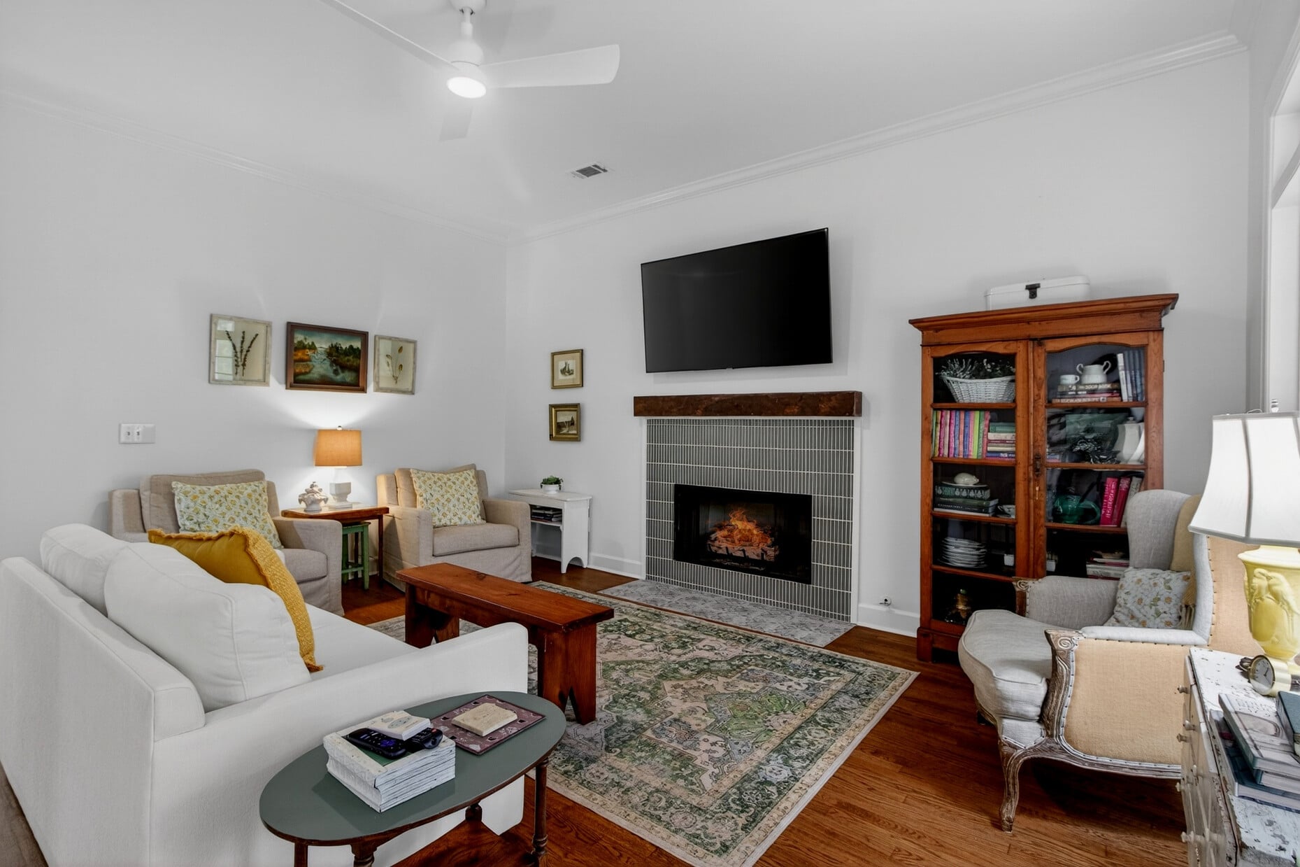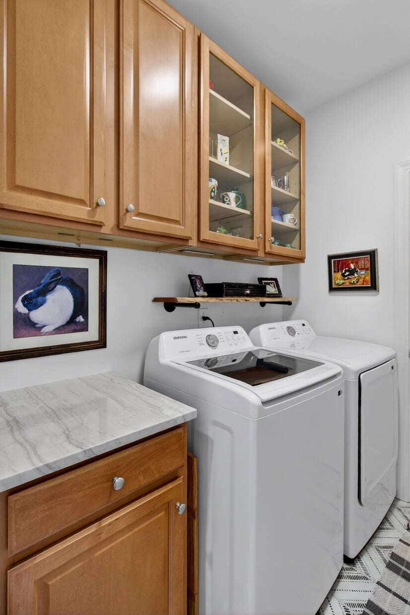The primary suite is conveniently located on the first floor and showcases a beautifully updated bath with a freestanding soaking tub, classic tilework, separate vanities, and polished fixtures — a true retreat. A dedicated first-floor laundry room with storage cabinets and a closet adds everyday convenience that is hard to come by.