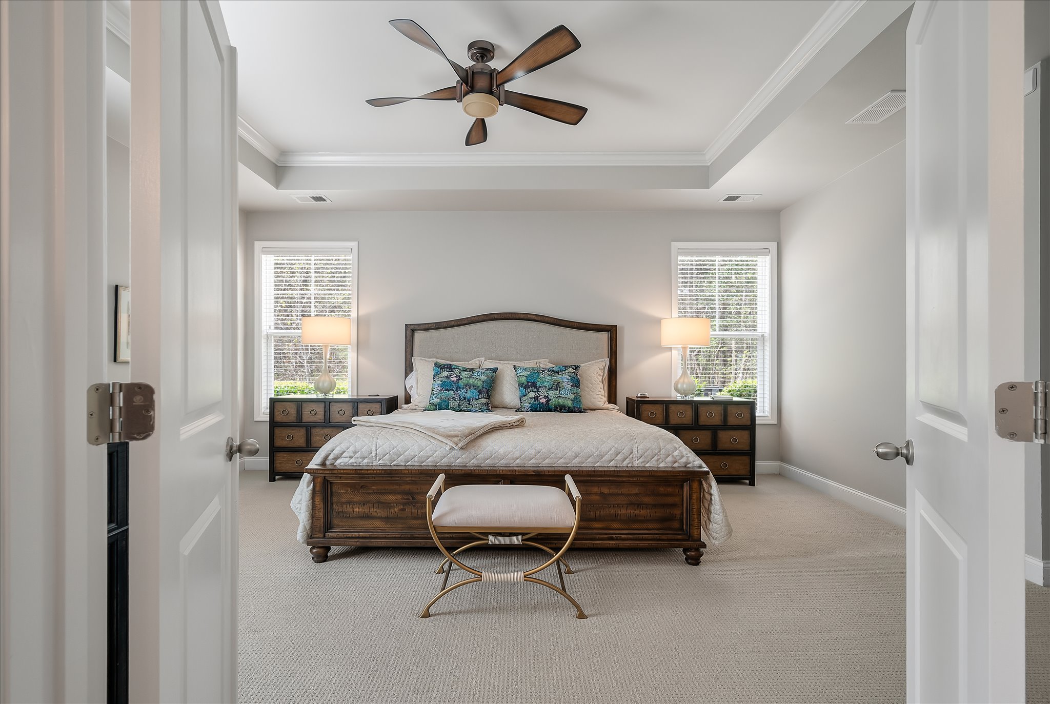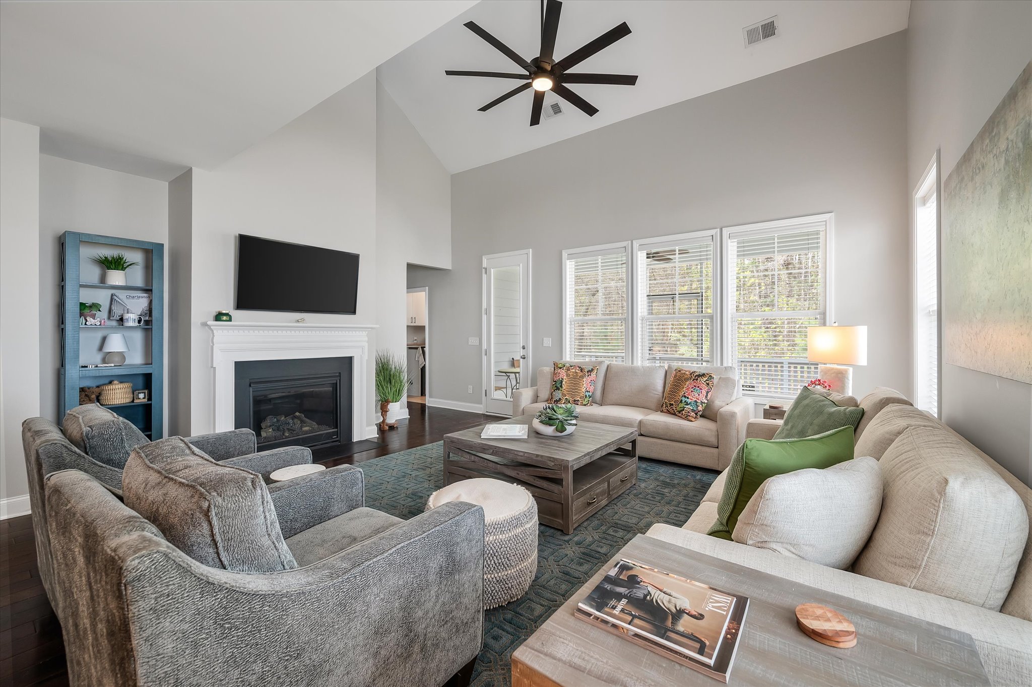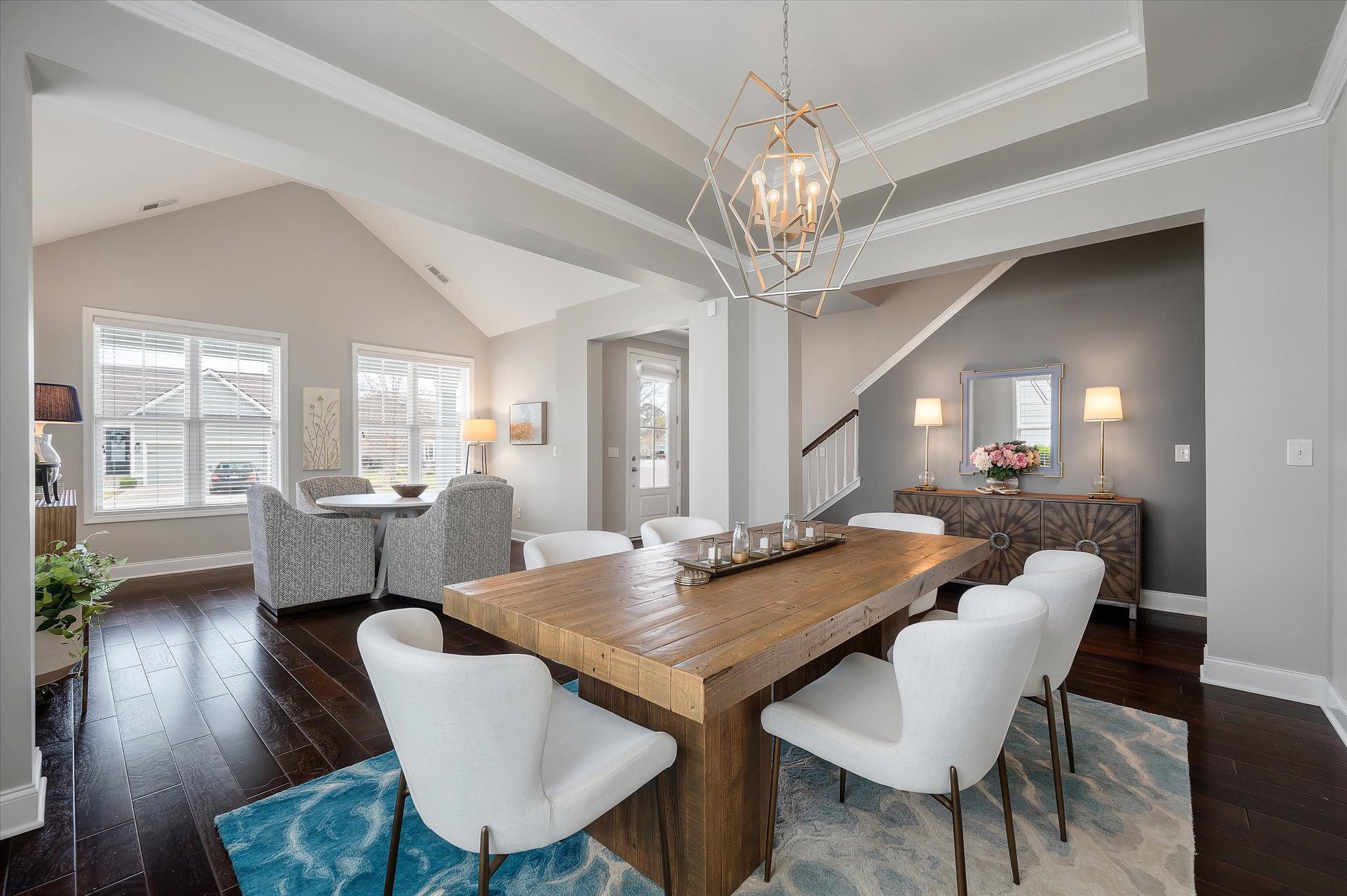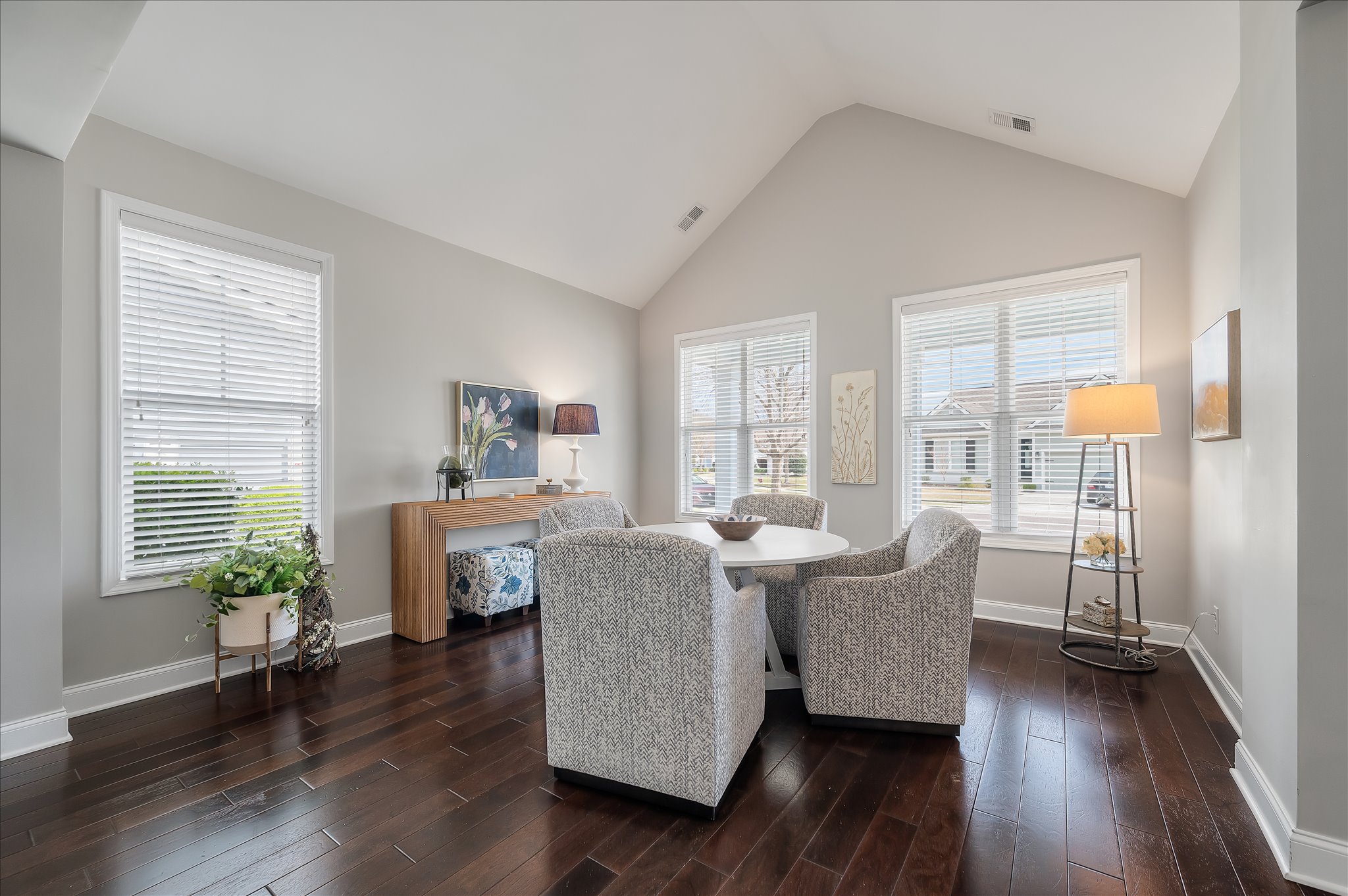 The thoughtfully designed main level features a primary bedroom suite, offering single-level living with the flexibility of additional accommodations upstairs. Soaring cathedral ceilings and elegant tray ceilings create an expansive atmosphere throughout, while wide-plank hardwood floors anchor the main living spaces with warmth and sophistication. A wide staircase adds an architectural statement as it leads to a generous loft — an ideal flex space for a home office, media room, or additional lounge area.