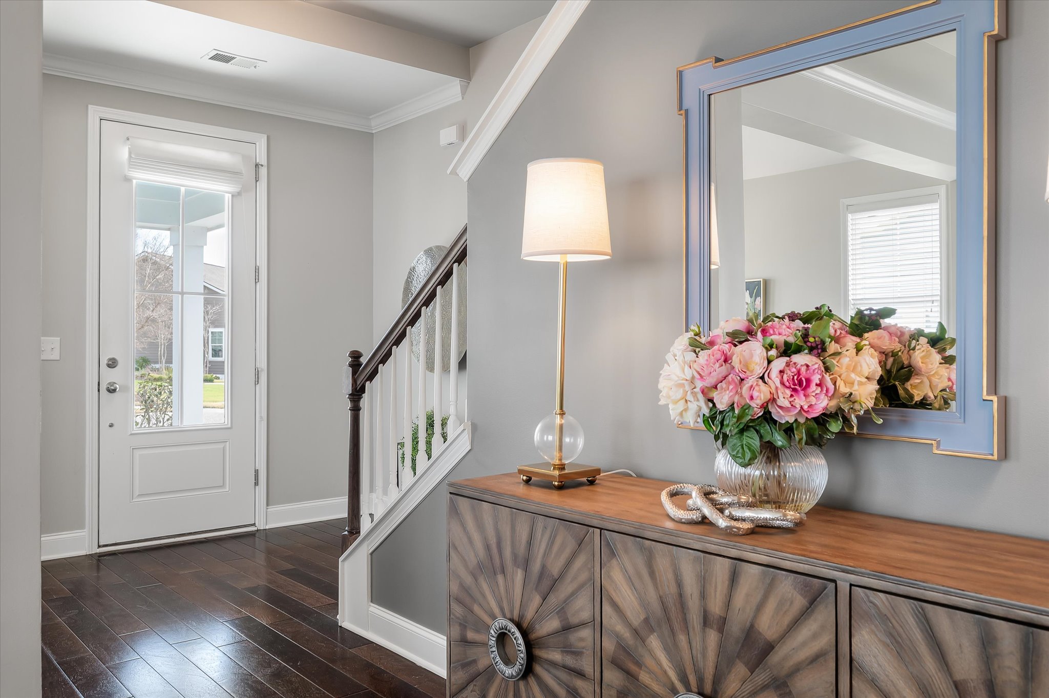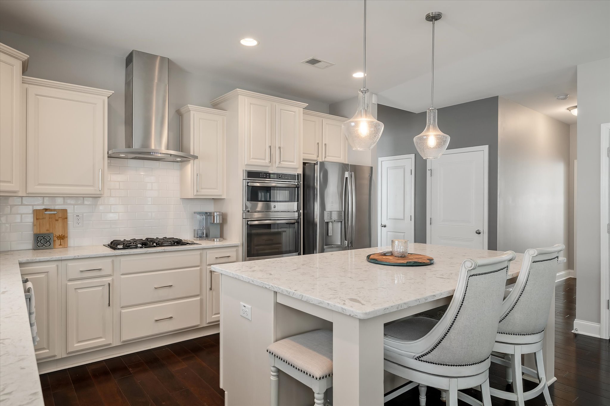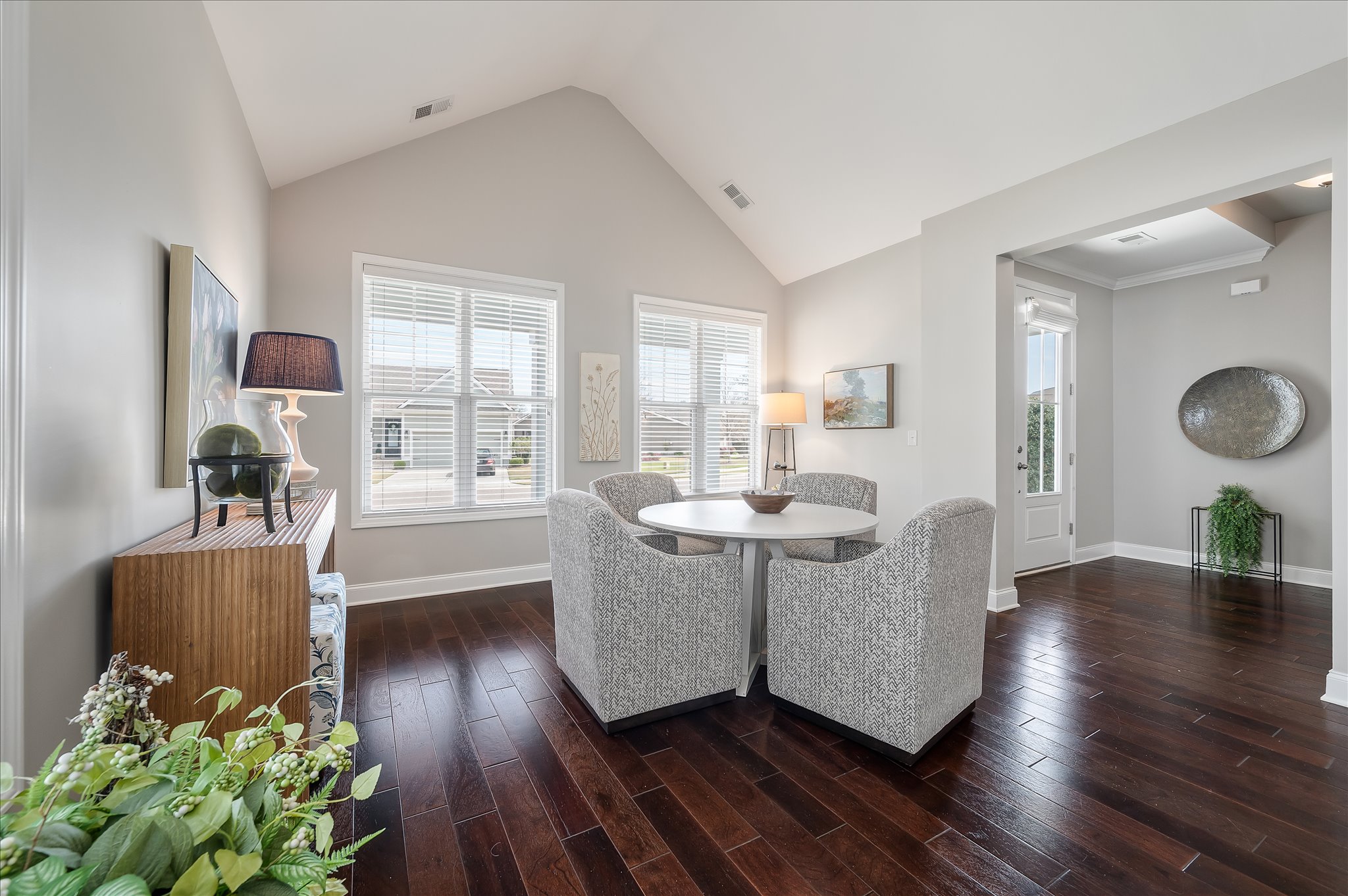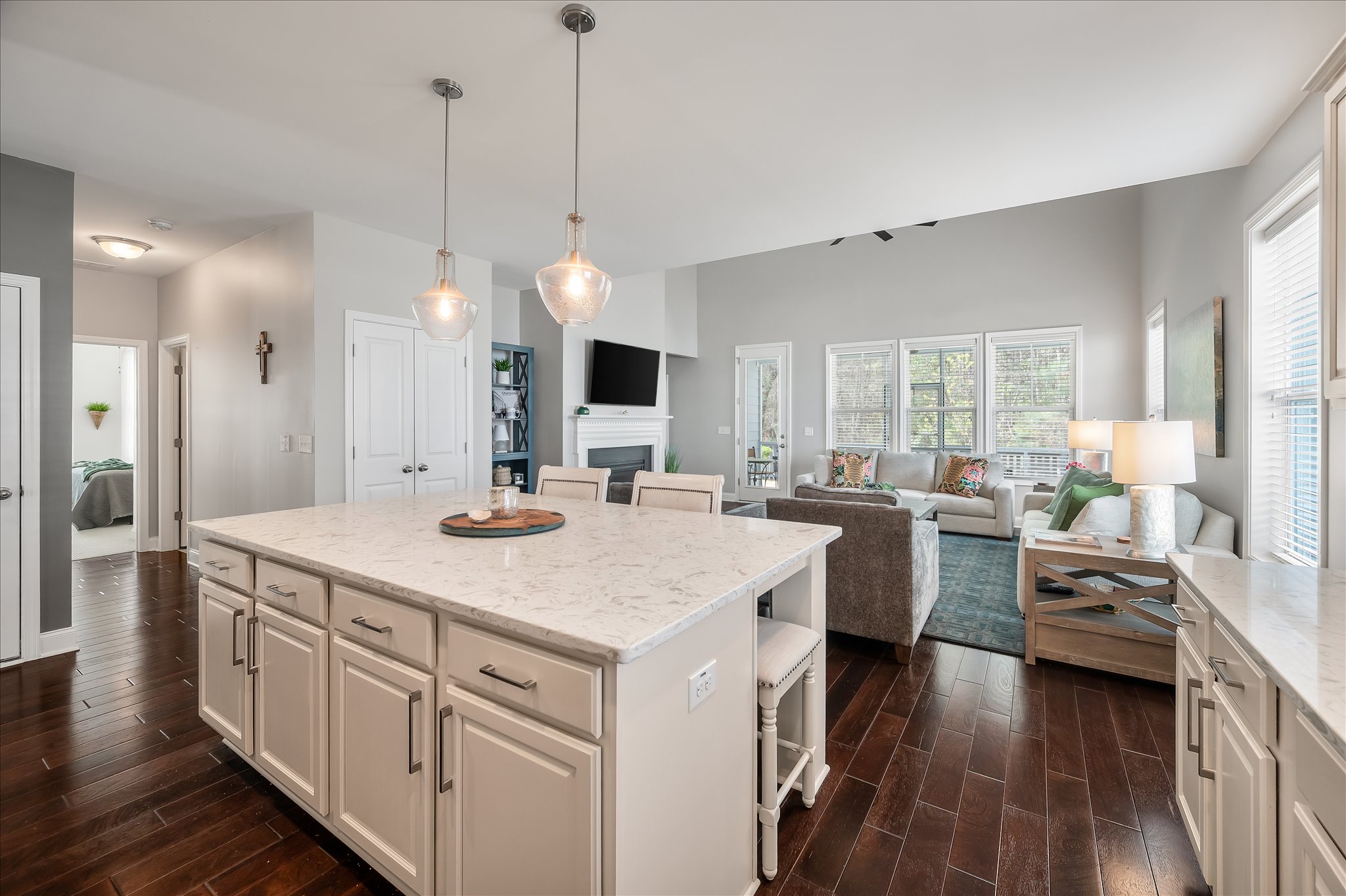 The thoughtfully designed main level features a primary bedroom suite, offering single-level living with the flexibility of additional accommodations upstairs. Soaring cathedral ceilings and elegant tray ceilings create an expansive atmosphere throughout, while wide-plank hardwood floors anchor the main living spaces with warmth and sophistication. A wide staircase adds an architectural statement as it leads to a generous loft — an ideal flex space for a home office, media room, or additional lounge area.