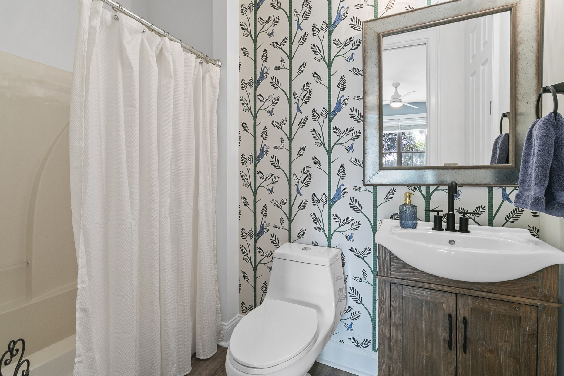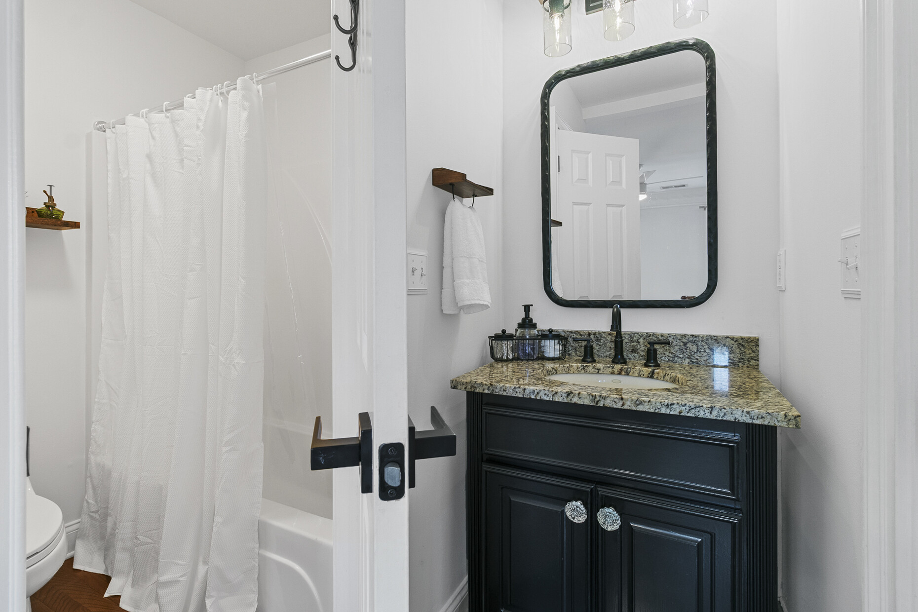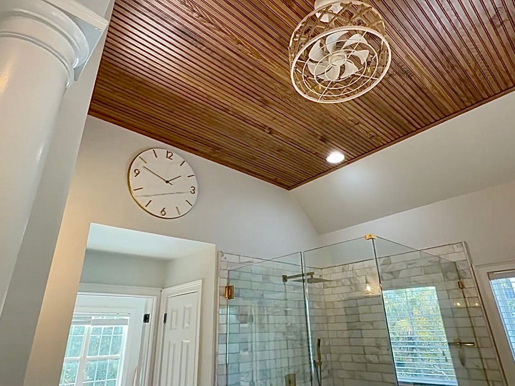 A main-level bedroom or office includes a dual-entry full bath, ideal for guests or flexible living needs. Upstairs, four additional bedrooms each have access to a full bath. The primary bath was remodeled in 2024 and features marble shower tile and a tongue-and-groove wood ceiling, with an adjoining full room that could easily be converted into an expansive walk-in closet. Hardwired sconces line the upstairs hallway, adding warmth and architectural detail.