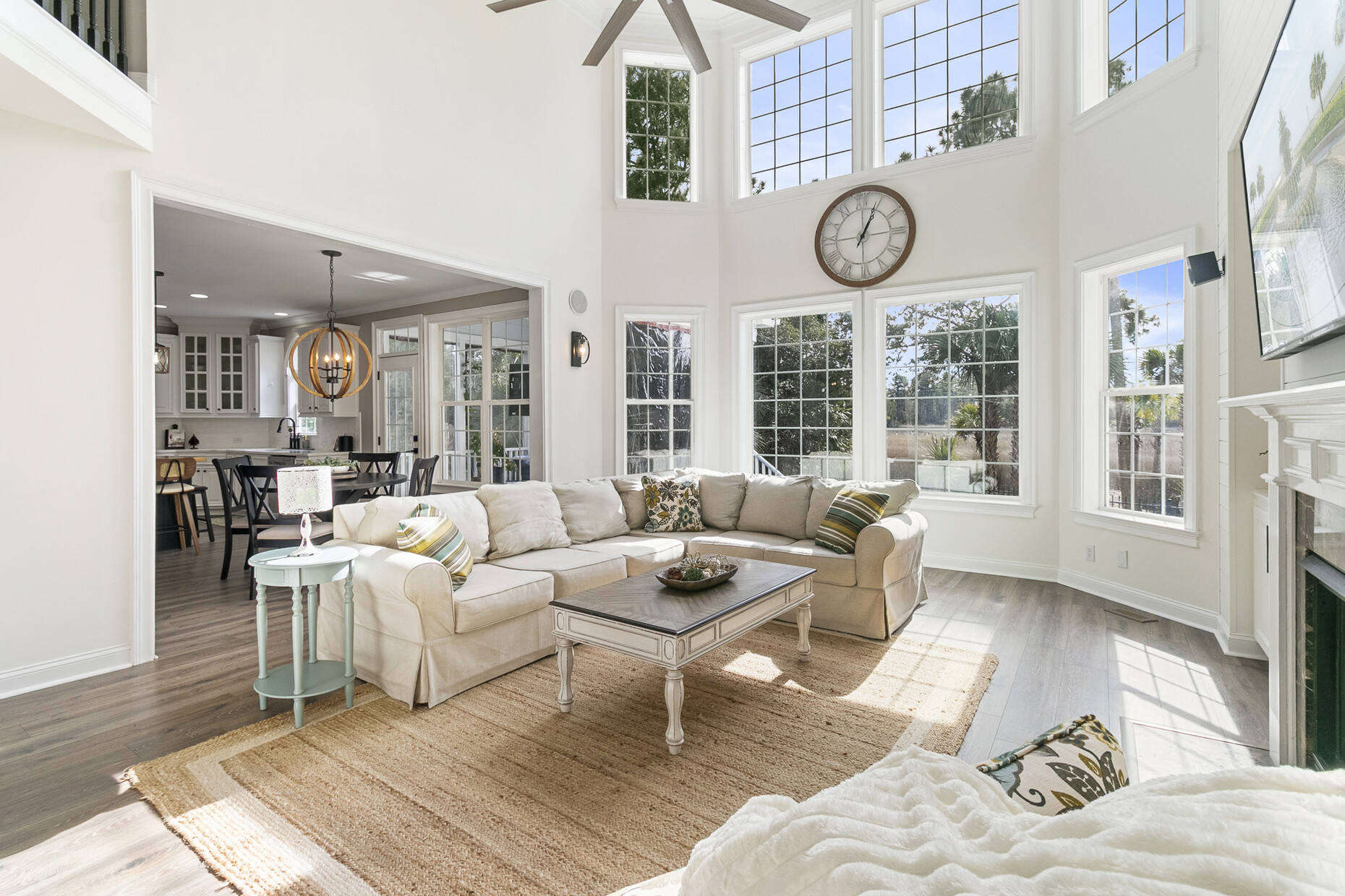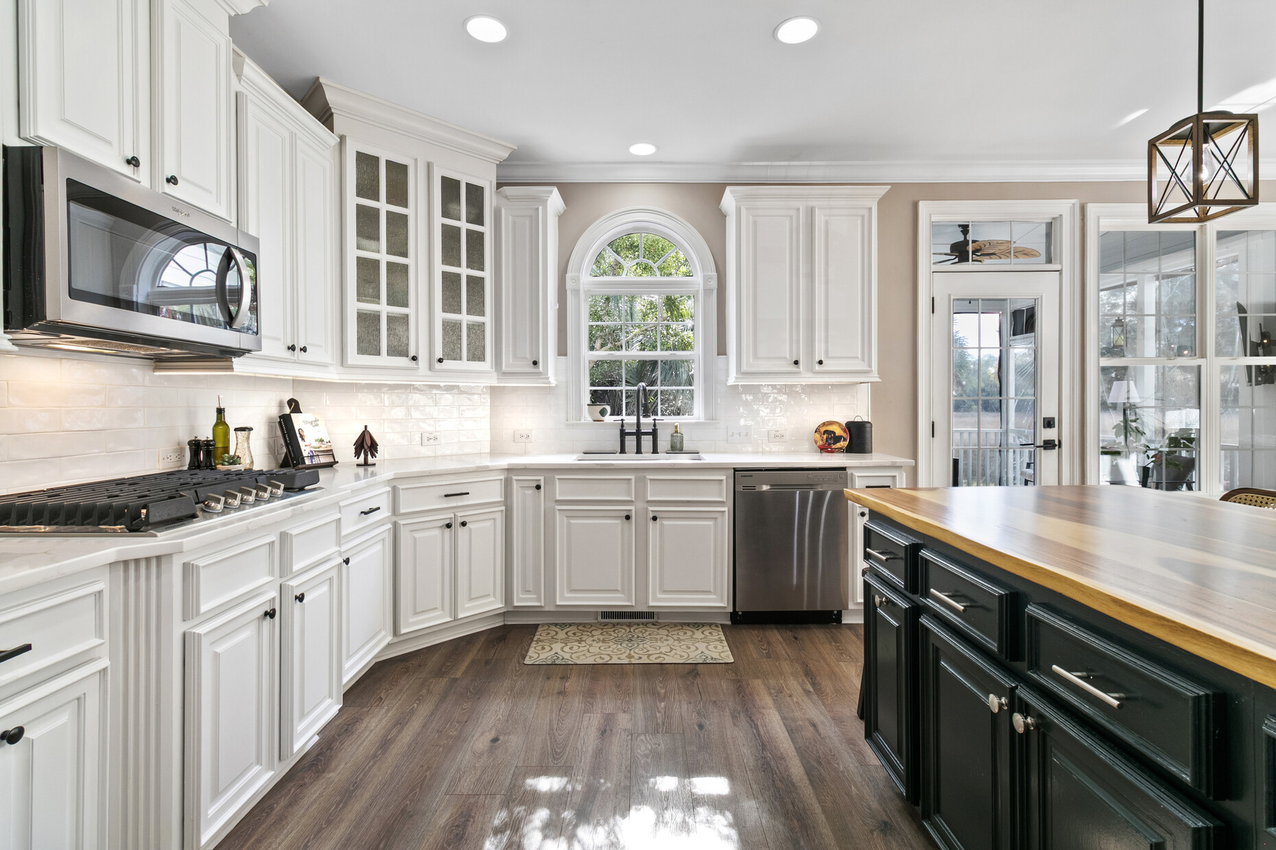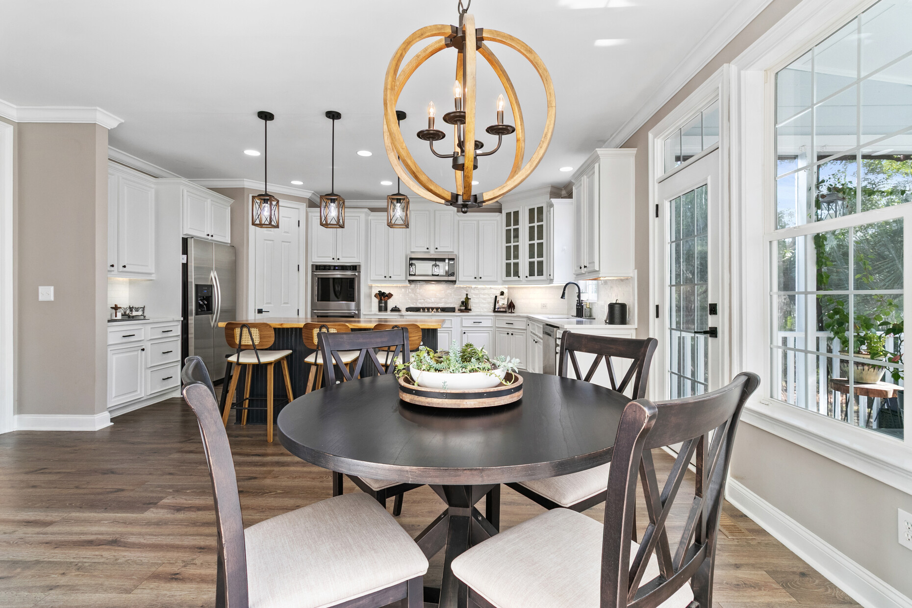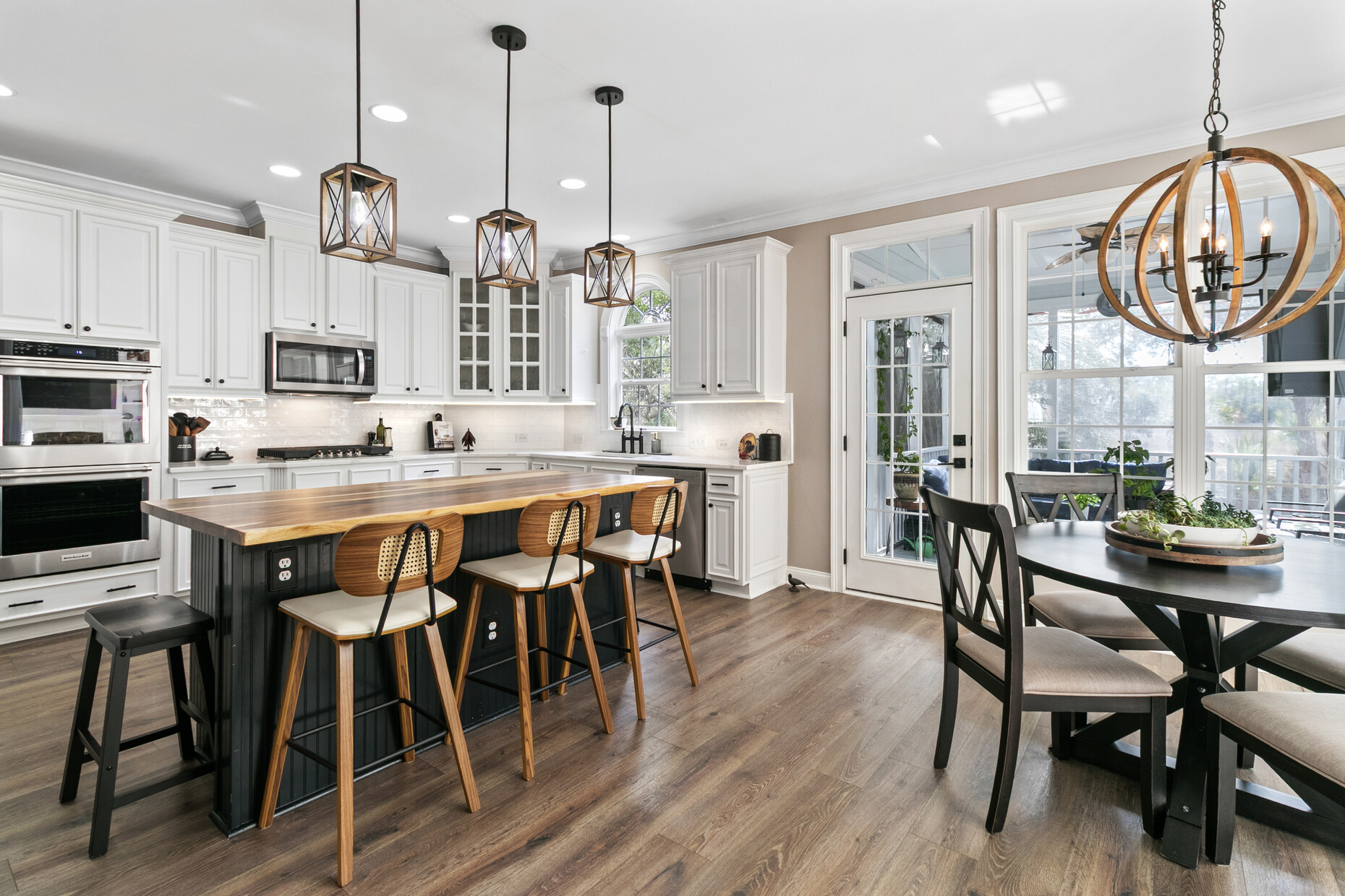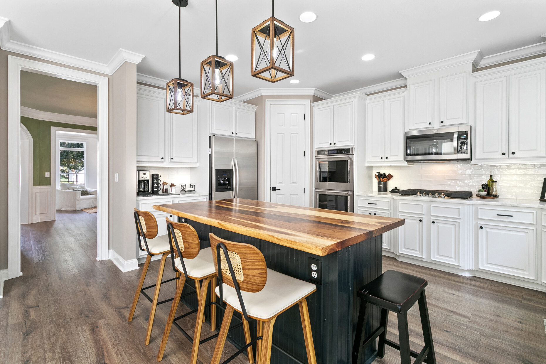 Inside, the home offers exceptional space and flexibility. High ceilings and solid 8-foot wood doors define the main level, while the remodeled kitchen (2023) anchors the home with an Acadian wood live-edge island, new appliances, a 5-burner gas cooktop, and convenient pull-out lower cabinets. The kitchen opens seamlessly to a dramatic two-story family room with shiplap accents, oversized windows, and an airy, open feel.
