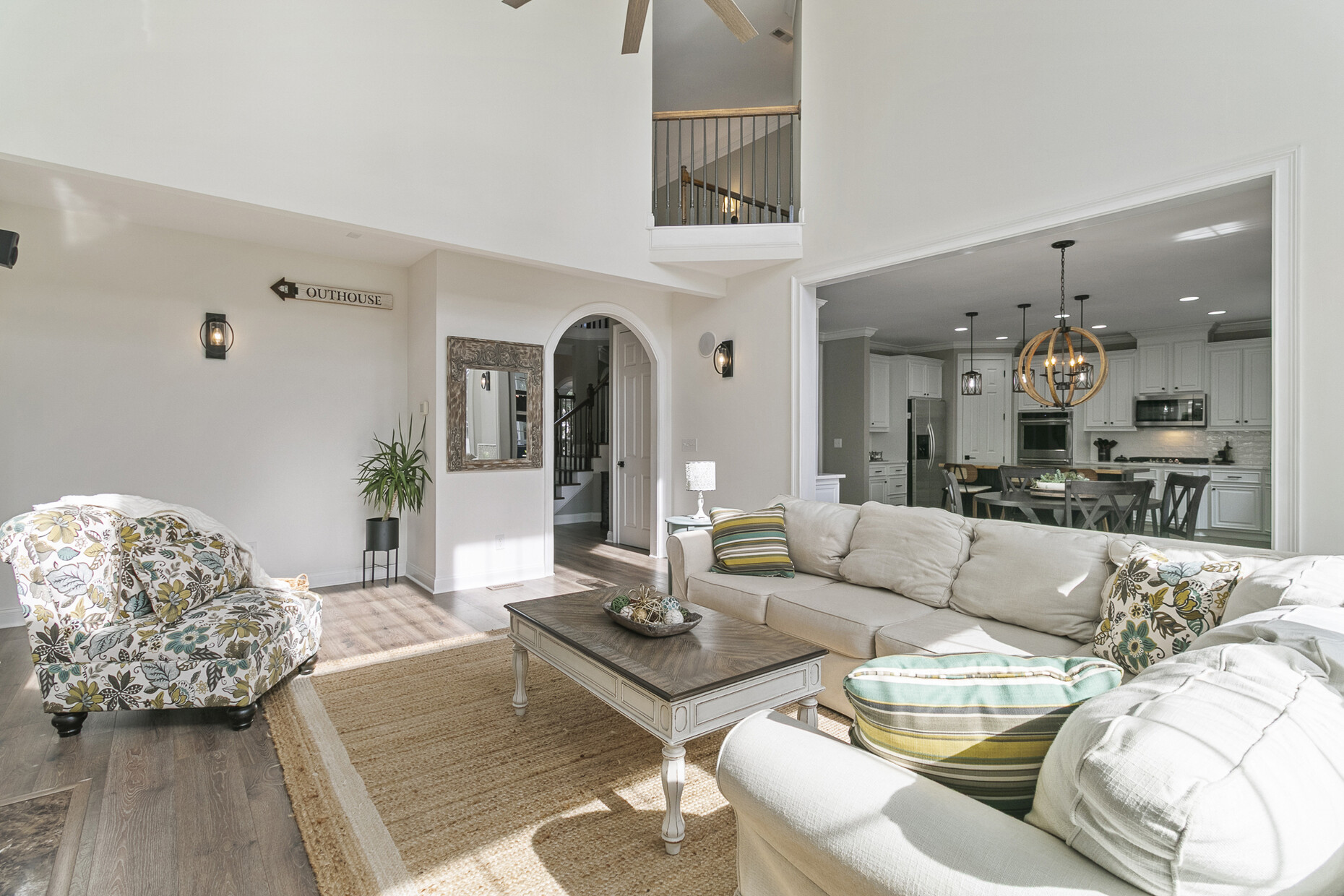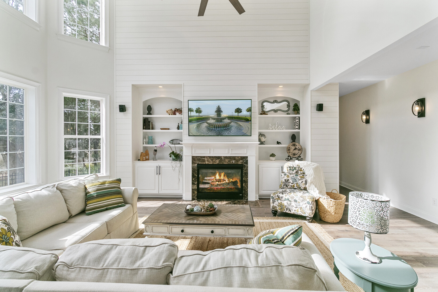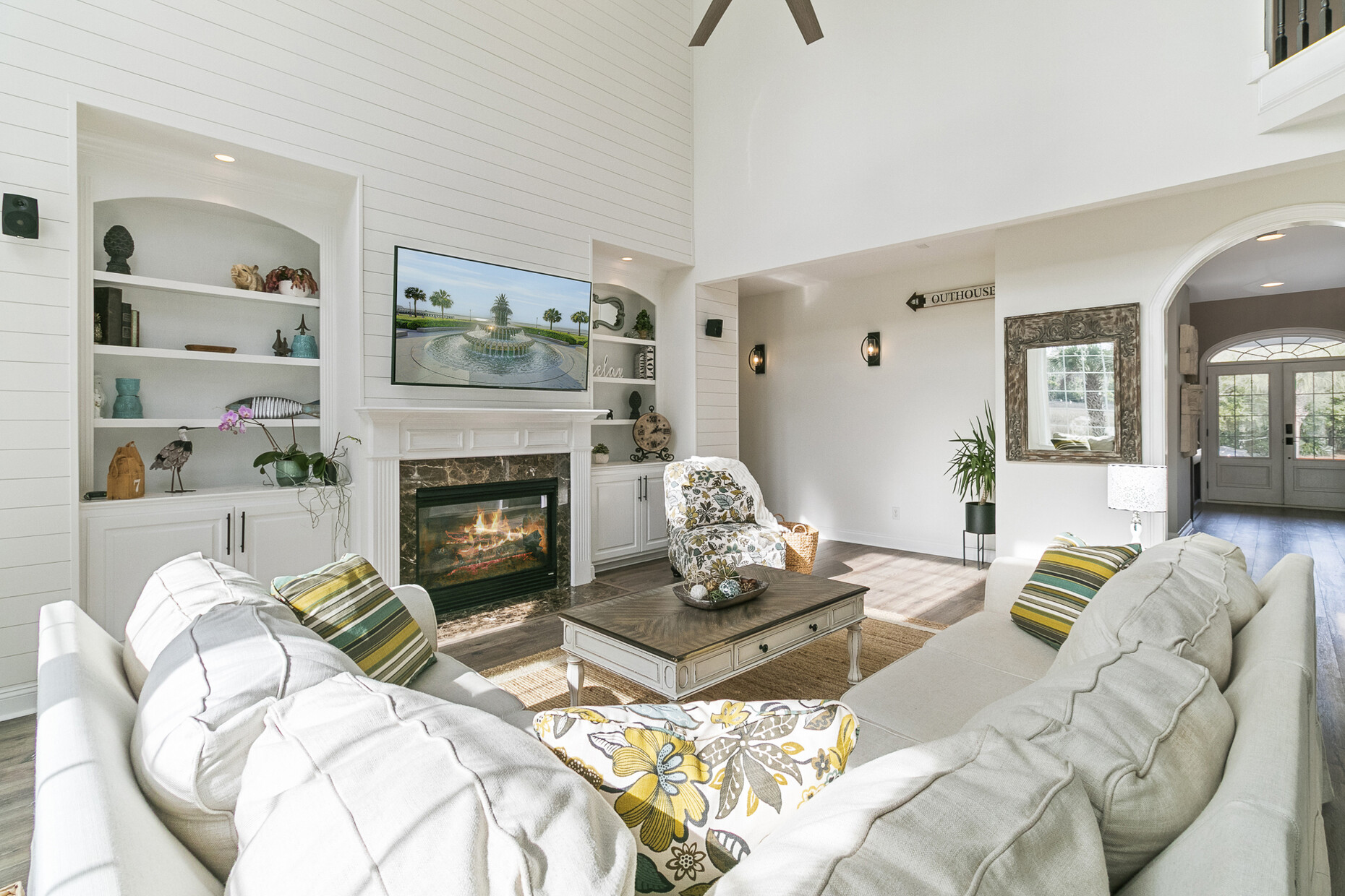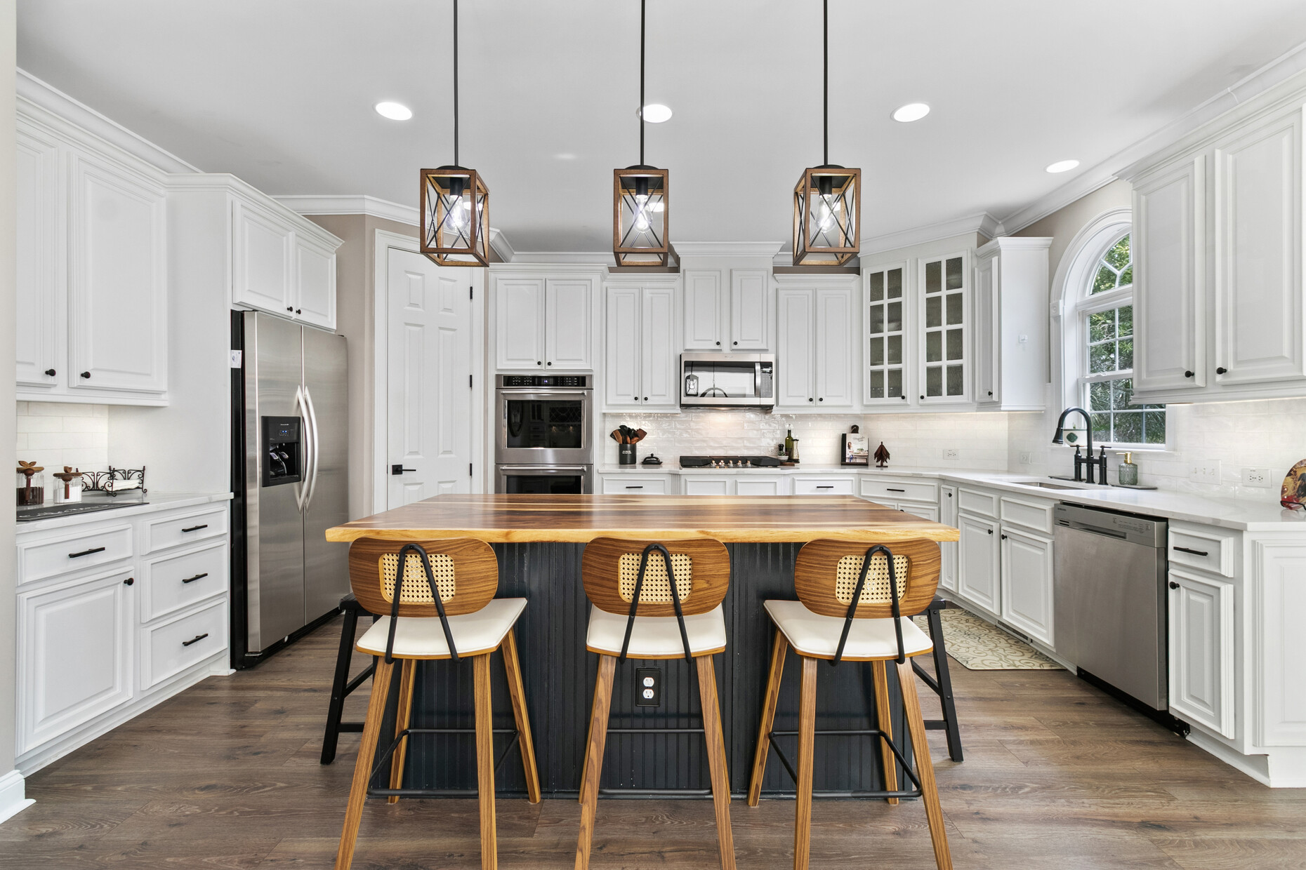 Inside, the home offers exceptional space and flexibility. High ceilings and solid 8-foot wood doors define the main level, while the remodeled kitchen (2023) anchors the home with an Acadian wood live-edge island, new appliances, a 5-burner gas cooktop, and convenient pull-out lower cabinets. The kitchen opens seamlessly to a dramatic two-story family room with shiplap accents, oversized windows, and an airy, open feel.