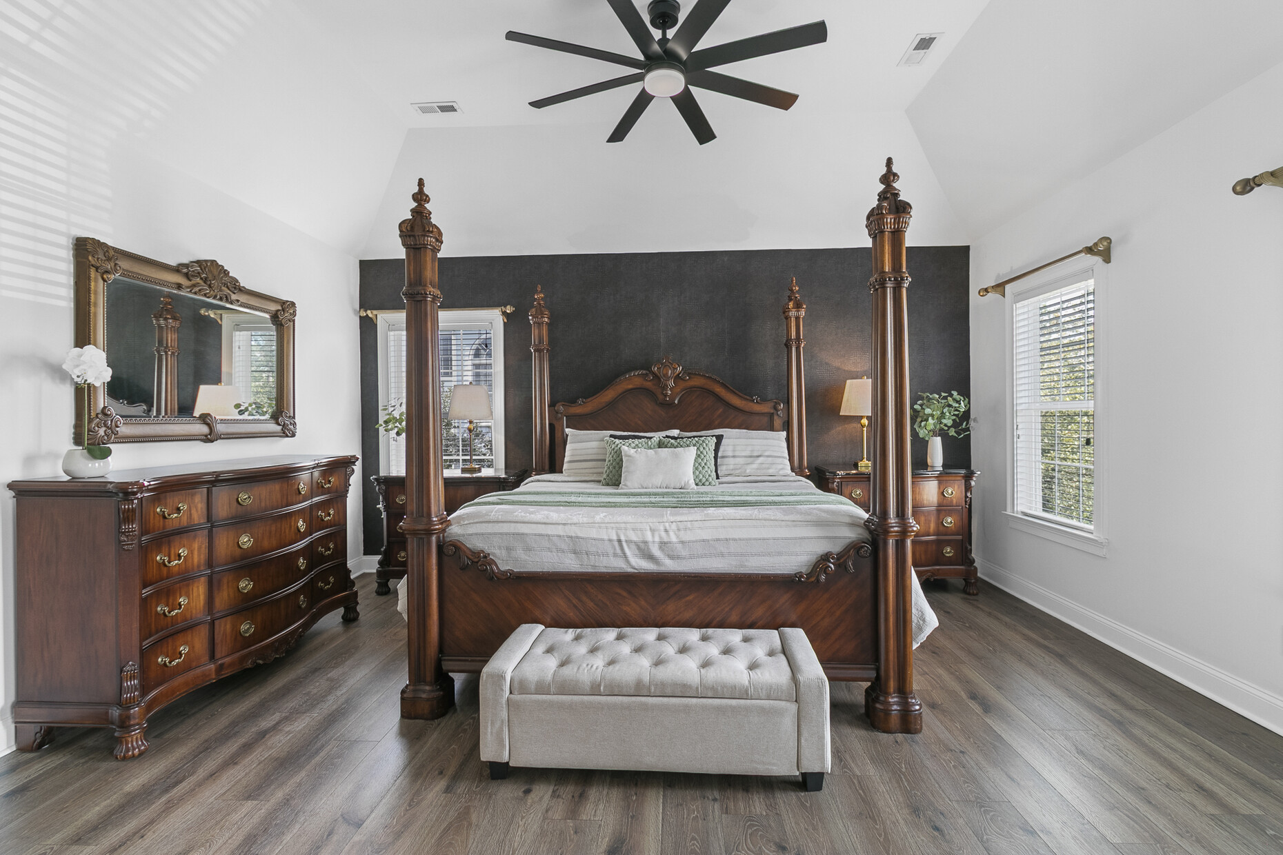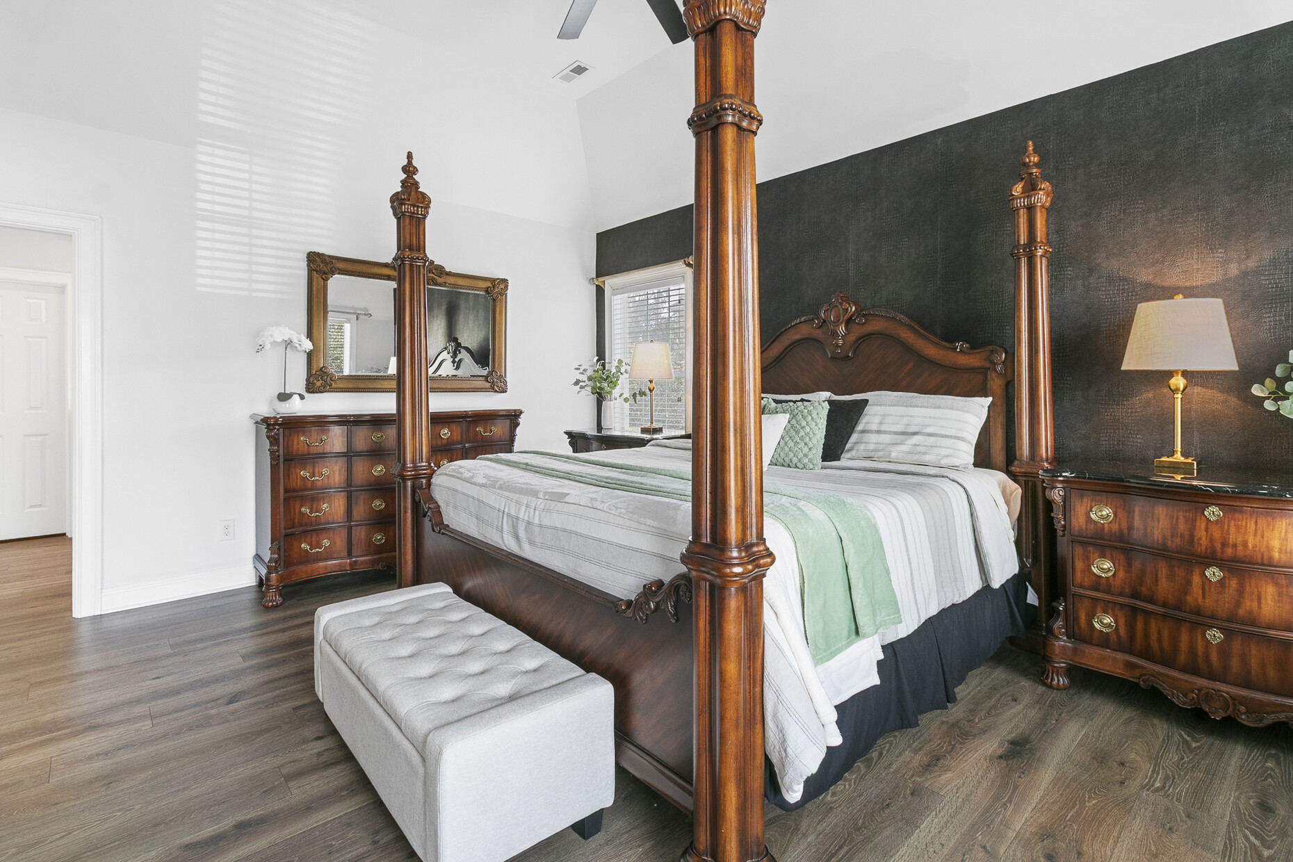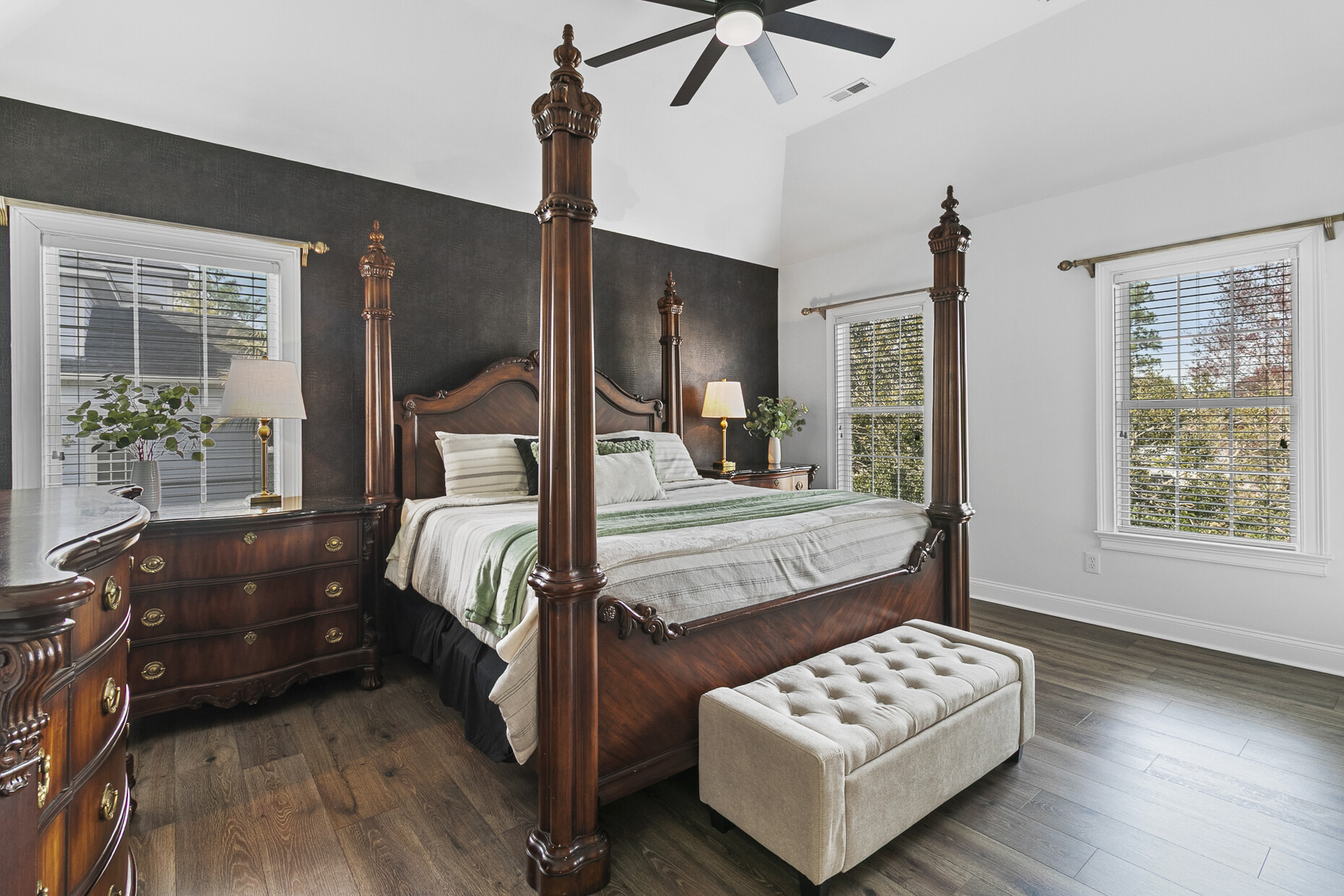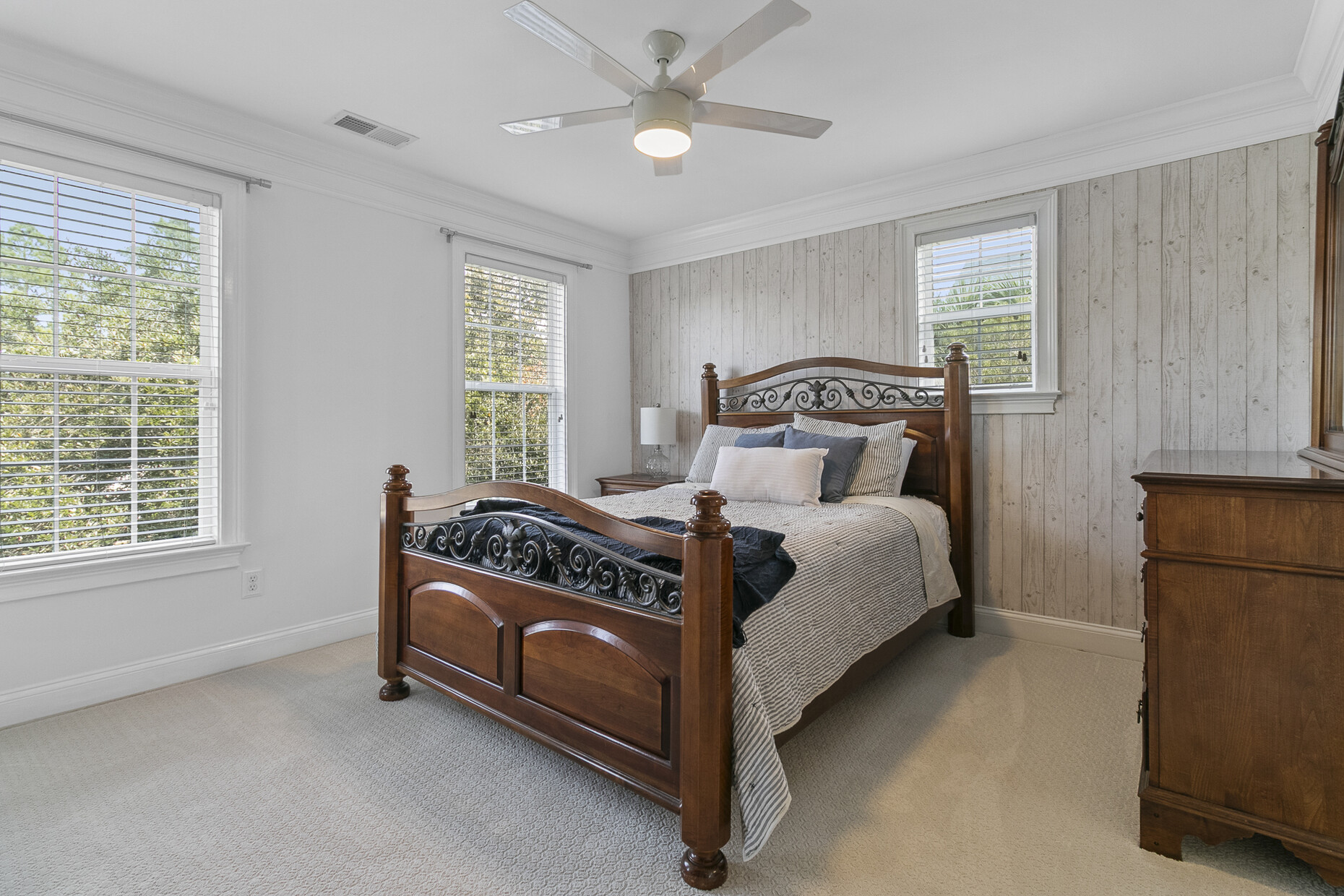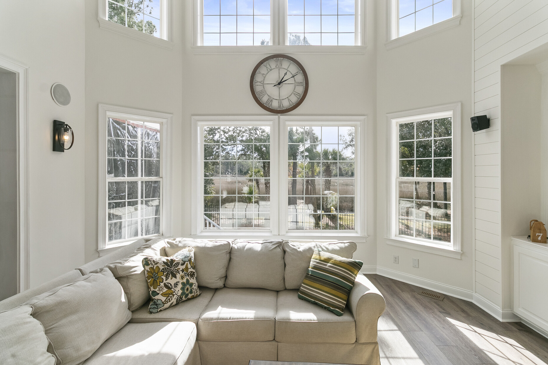 Inside, the home offers exceptional space and flexibility. High ceilings and solid 8-foot wood doors define the main level, while the remodeled kitchen (2023) anchors the home with an Acadian wood live-edge island, new appliances, a 5-burner gas cooktop, and convenient pull-out lower cabinets. The kitchen opens seamlessly to a dramatic two-story family room with shiplap accents, oversized windows, and an airy, open feel.