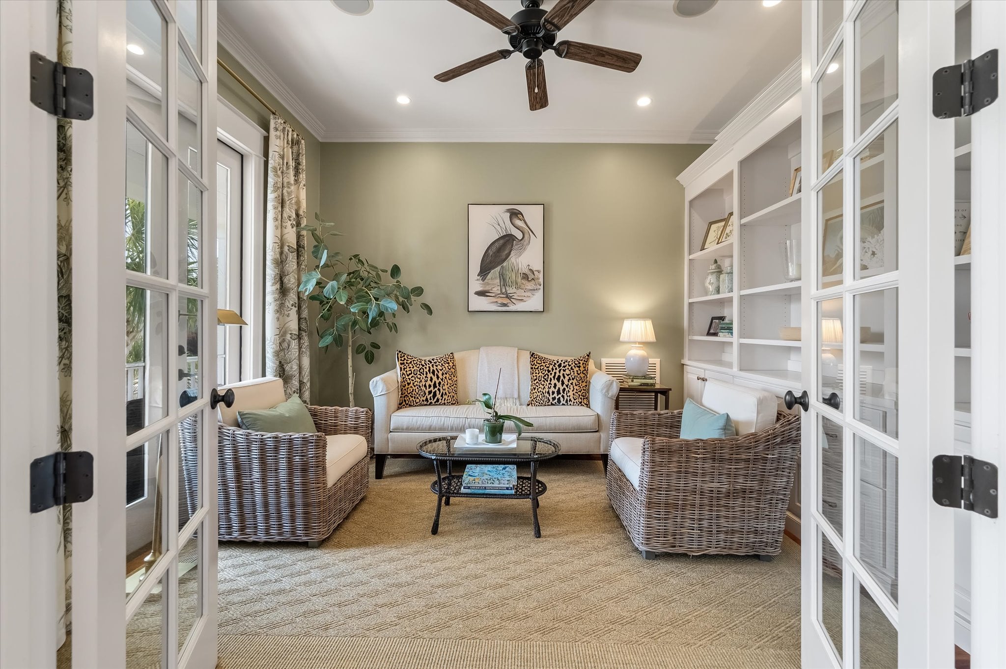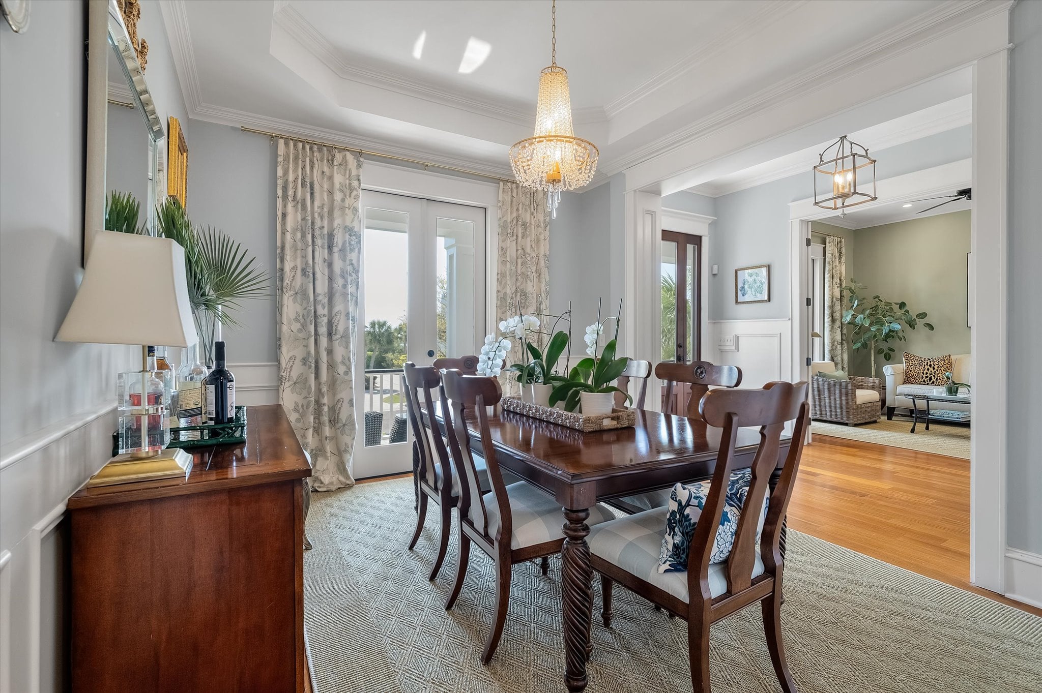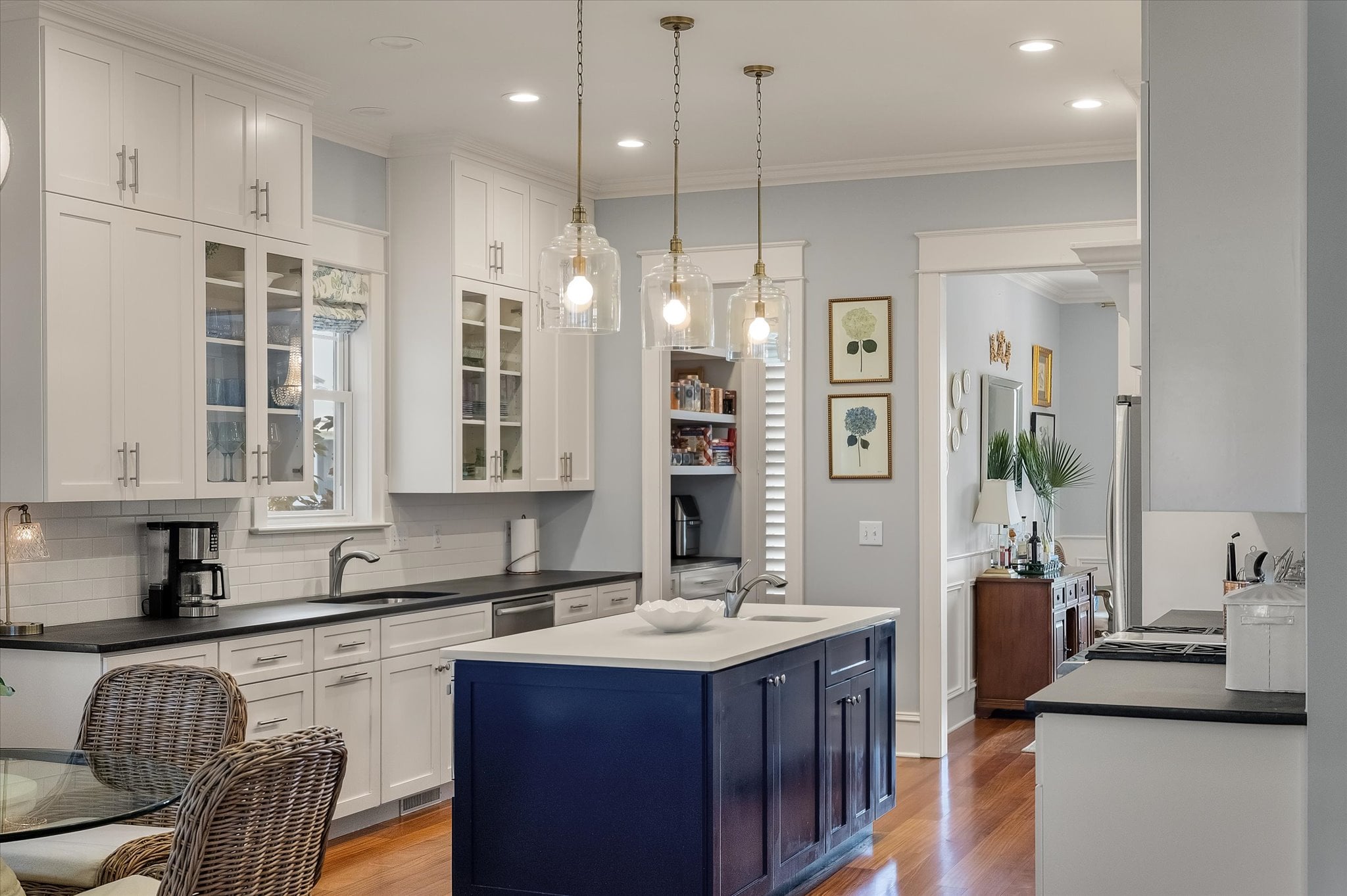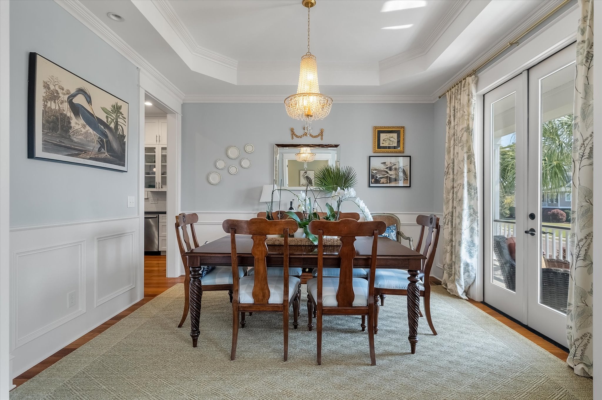 Just off the entry, a room with built-ins and French doors opening to the porch offers flexibility as a home office, reading room, or additional gathering space. The dining room carries the home's attention to detail with a tray ceiling, millwork, and French doors that maintain the indoor-outdoor connection. It flows naturally into the remodeled kitchen, which features a butler's pantry, ample storage, and banquette seating that adds warmth to the space.