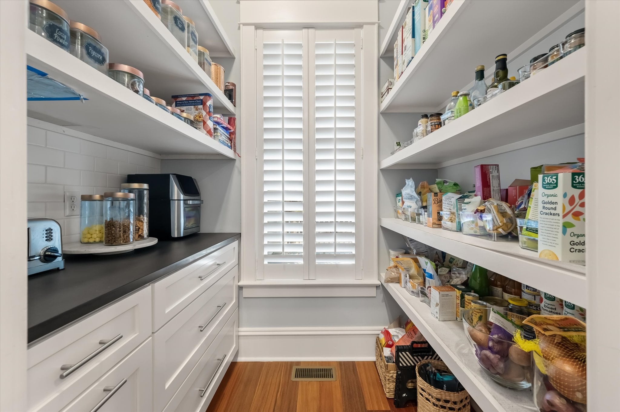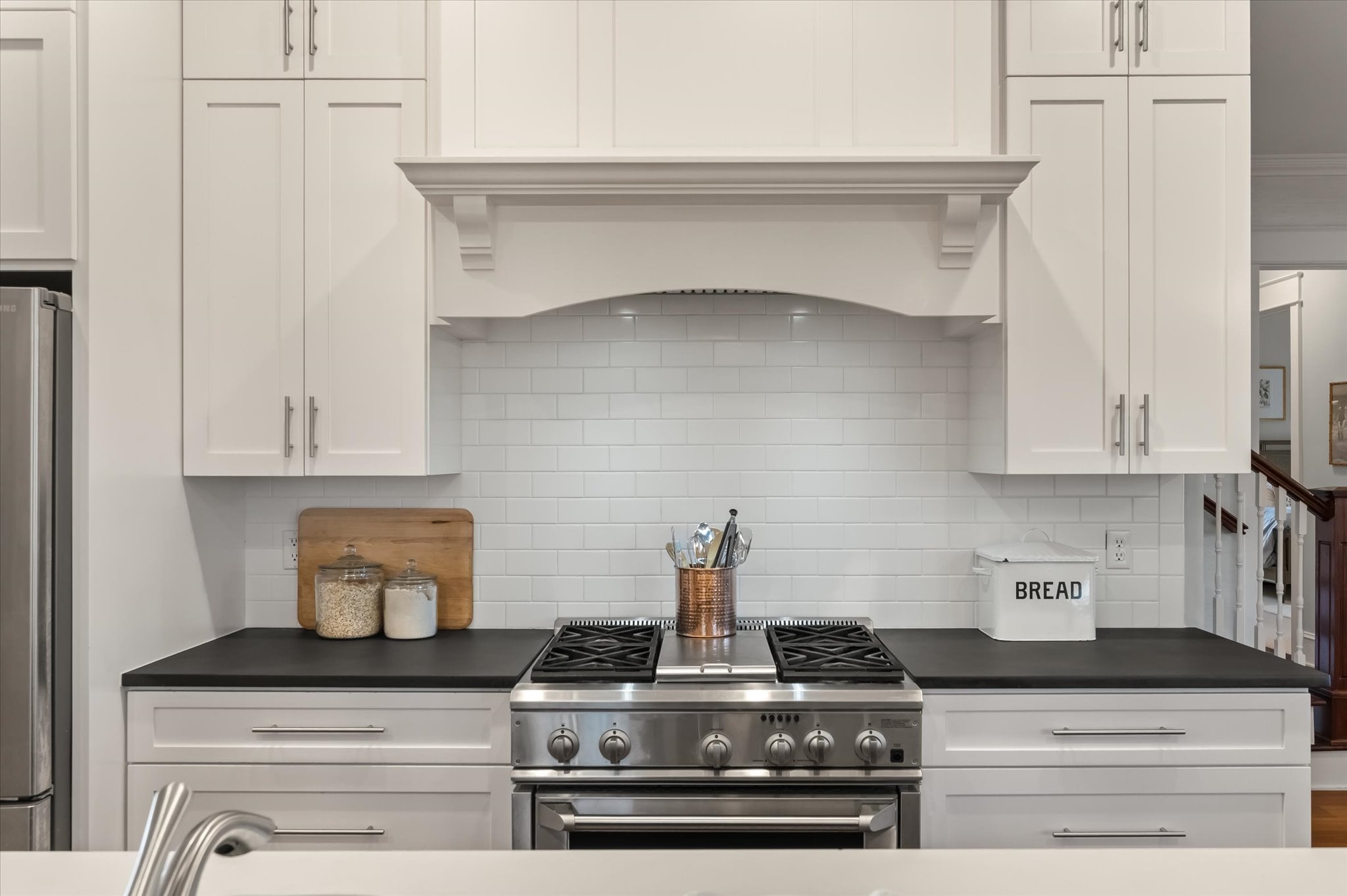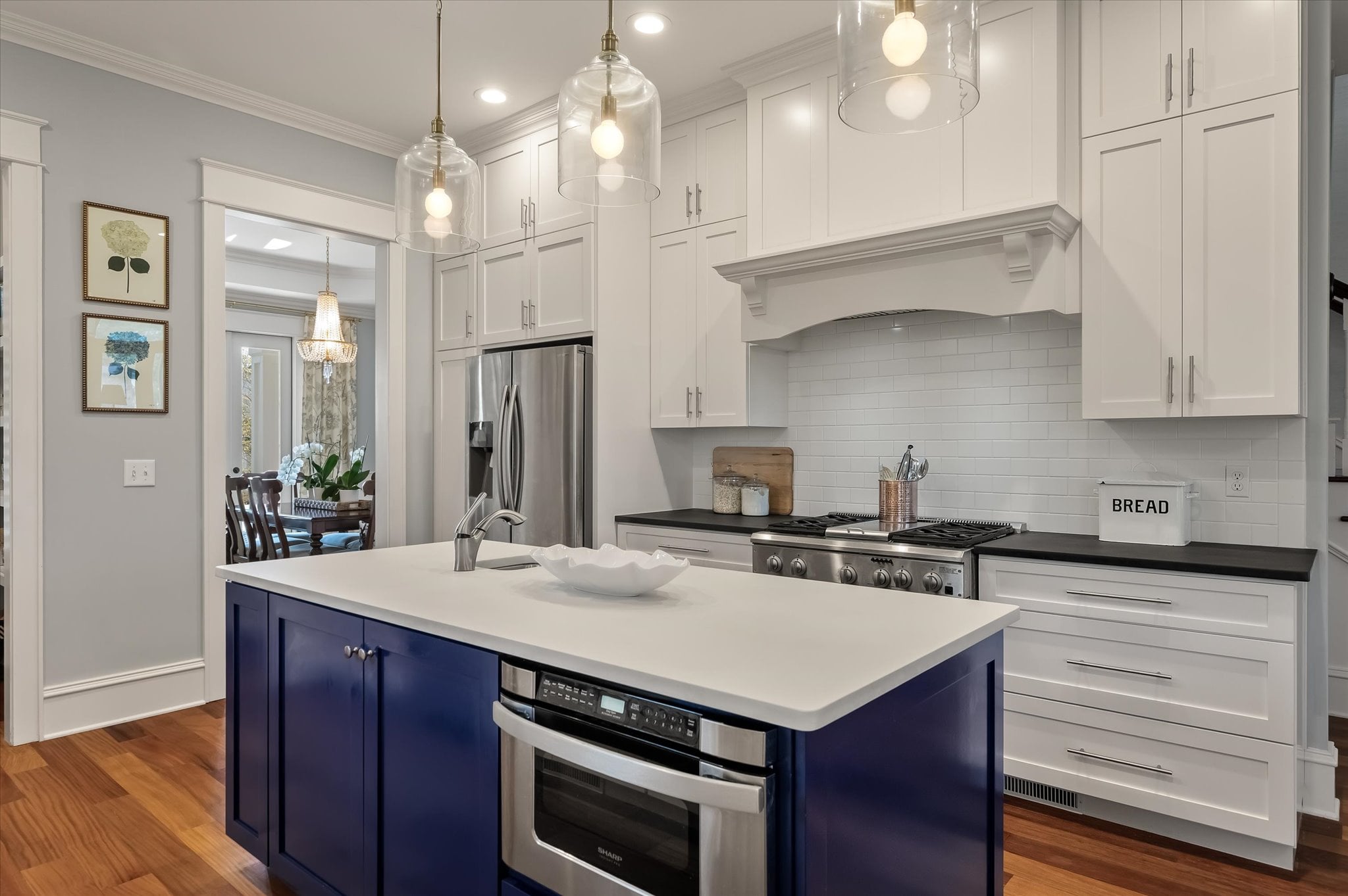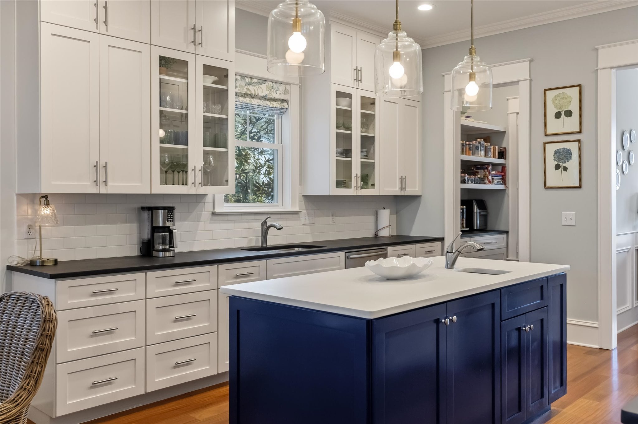 Just off the entry, a room with built-ins and French doors opening to the porch offers flexibility as a home office, reading room, or additional gathering space. The dining room carries the home's attention to detail with a tray ceiling, millwork, and French doors that maintain the indoor-outdoor connection. It flows naturally into the remodeled kitchen, which features a butler's pantry, ample storage, and banquette seating that adds warmth to the space.