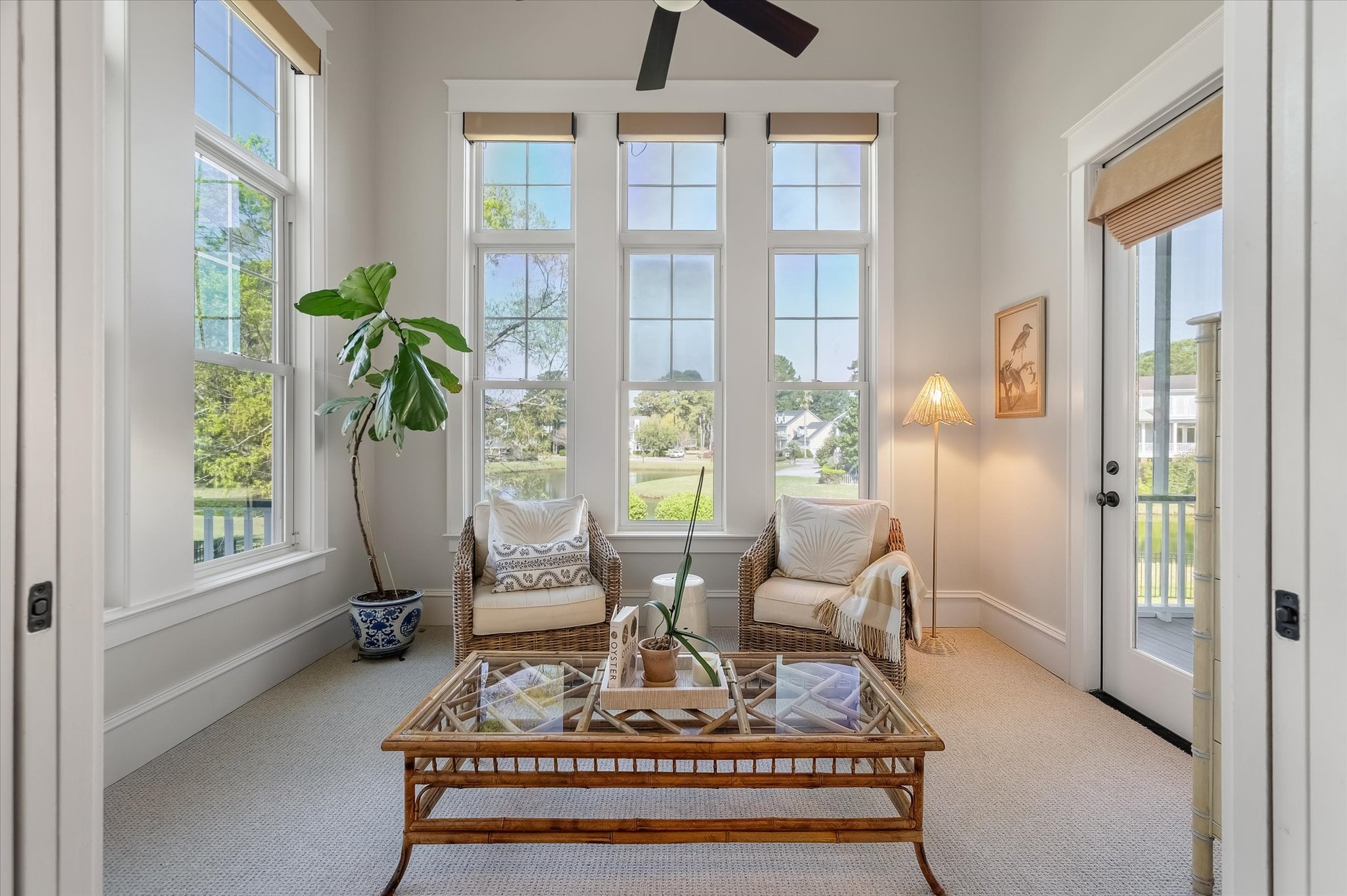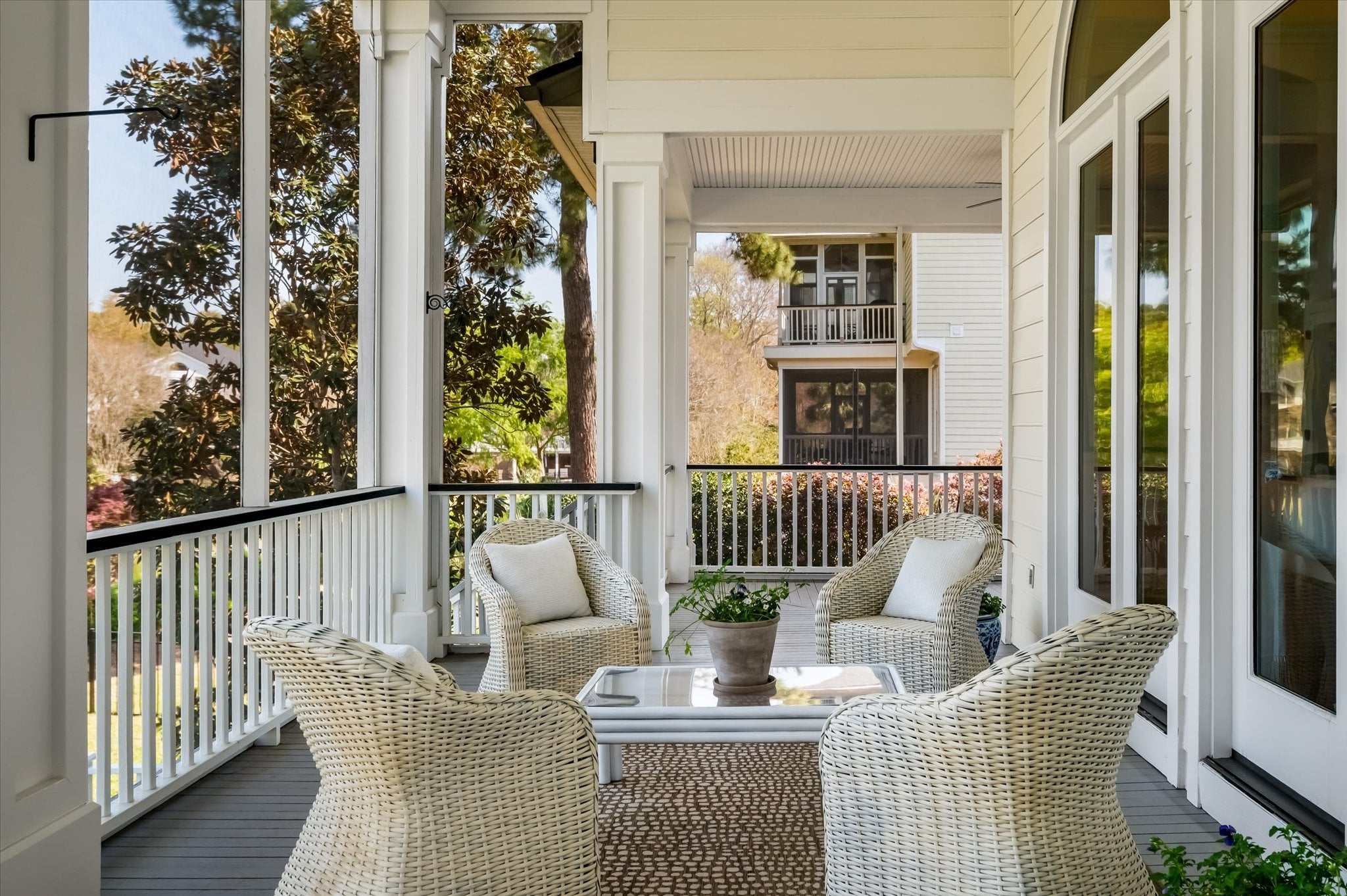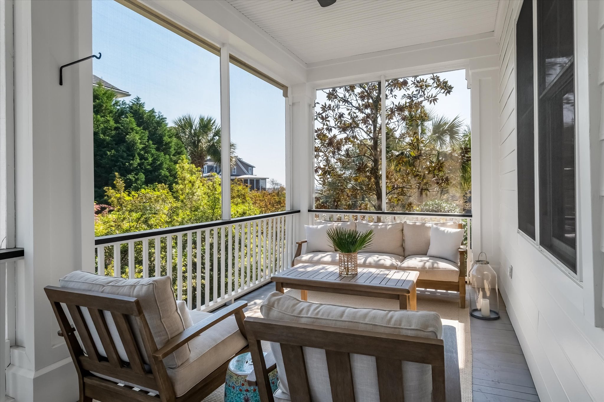 Inside, 10-foot ceilings on the main level and coffered ceilings in the living room create a generous sense of space. Oversized Palladian windows fill the room with natural light and tranquil pond views, and when the doors are open, the breeze moves freely through. The living room opens directly to the home's standout feature: an L-shaped screened porch that stretches along the back of the home, overlooking the pond with peek-a-boo views of The Sound. It's the kind of space that gets used every day.