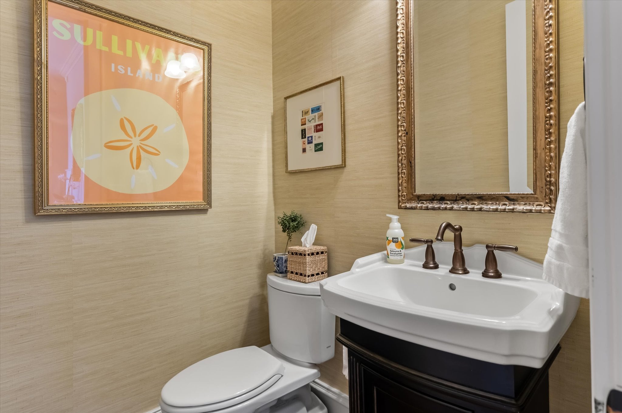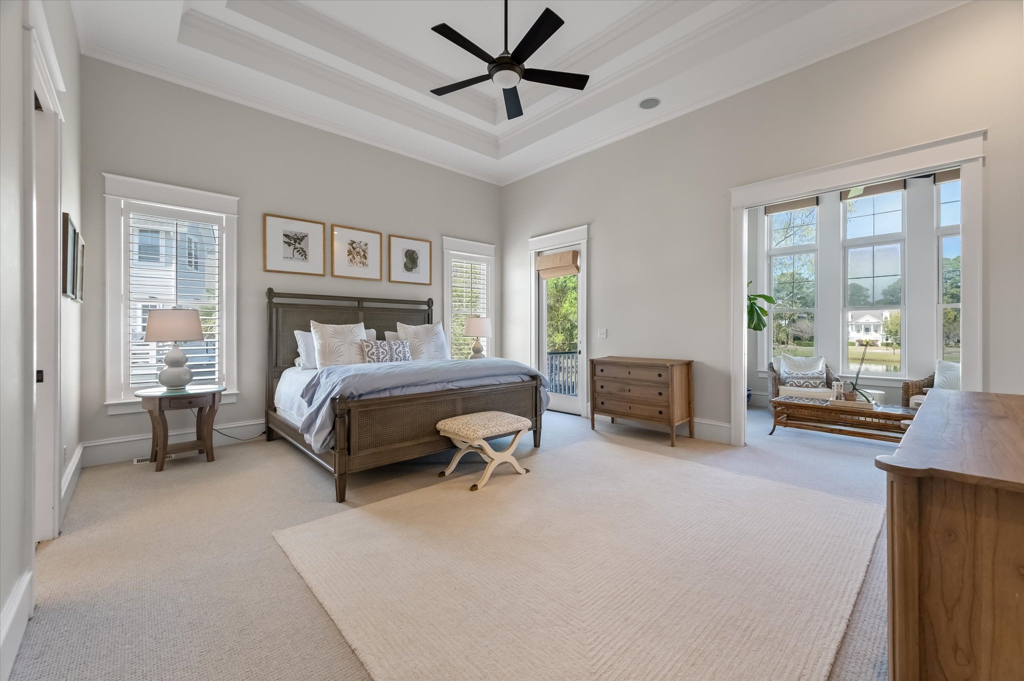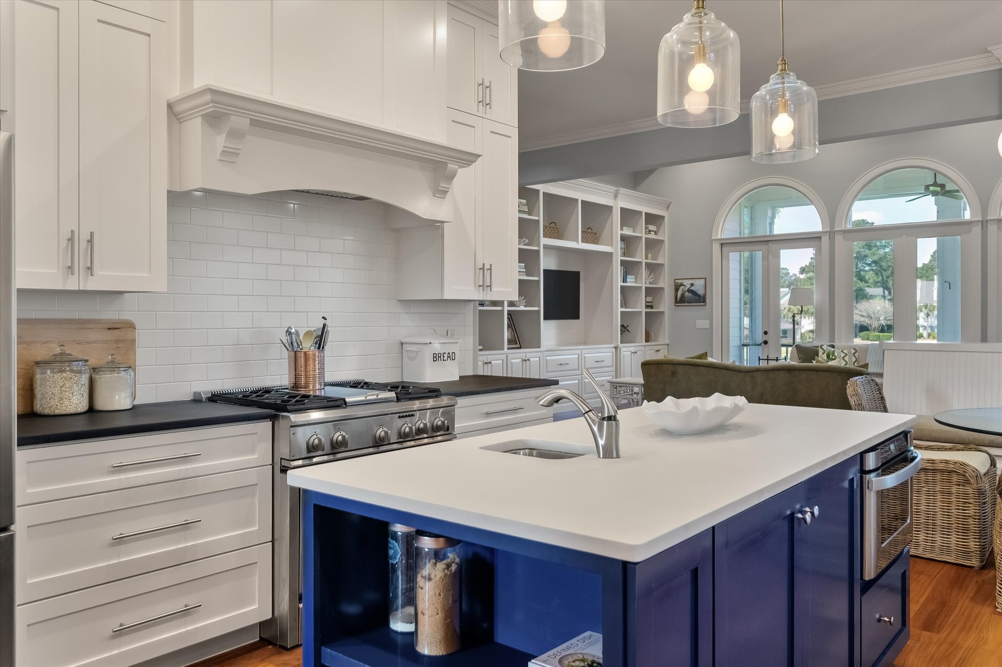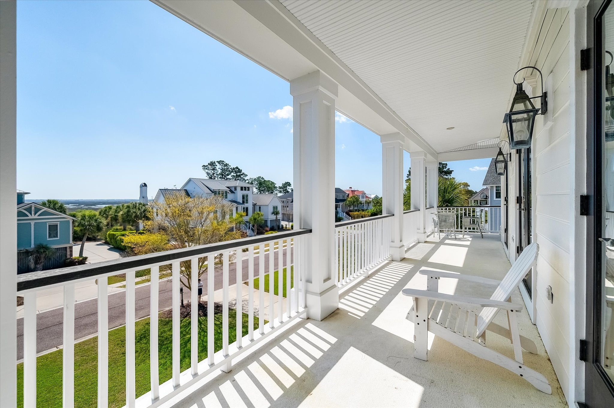 Inside, 10-foot ceilings on the main level and coffered ceilings in the living room create a generous sense of space. Oversized Palladian windows fill the room with natural light and tranquil pond views, and when the doors are open, the breeze moves freely through. The living room opens directly to the home's standout feature: an L-shaped screened porch that stretches along the back of the home, overlooking the pond with peek-a-boo views of The Sound. It's the kind of space that gets used every day.